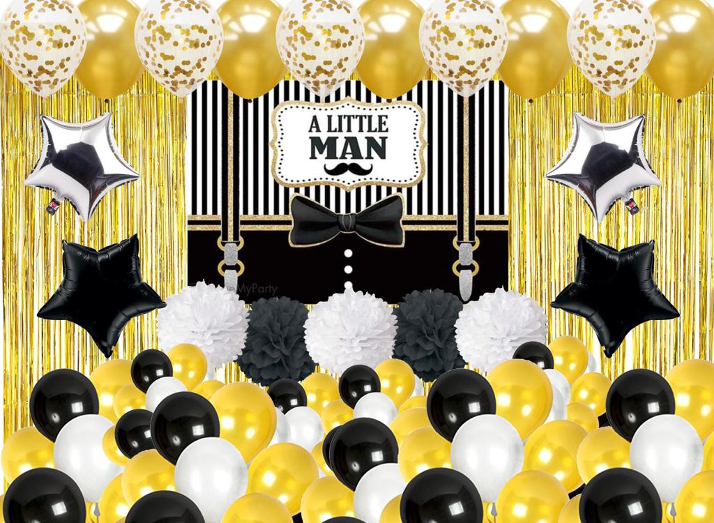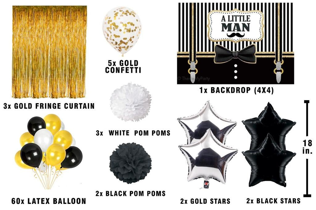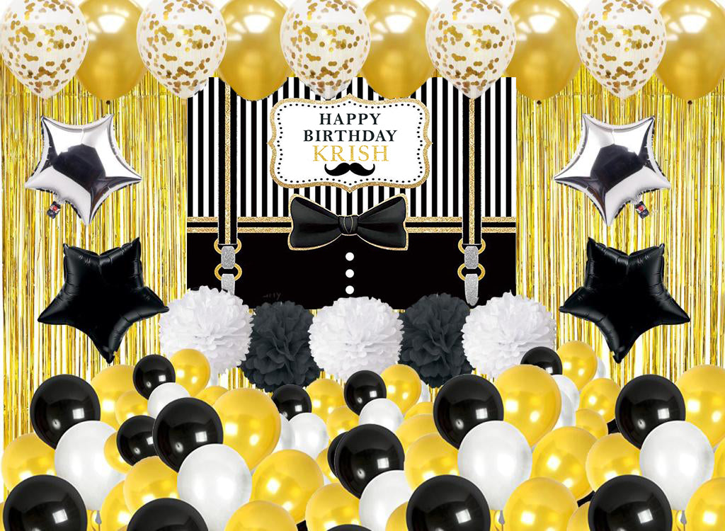 Package Includes -3 Pcs gold Fringe curtains - Each size 6ft x 3ft; Birthday backdrop printed on high quality star flex - Size 4 by 4 ft, 60 pc latex balloons (black, white and gold – 20 Each) 5 pc gold confetti ,4 star Foil Balloons- 2 silver and 2 black-18 each and 5 Pompom Black and White