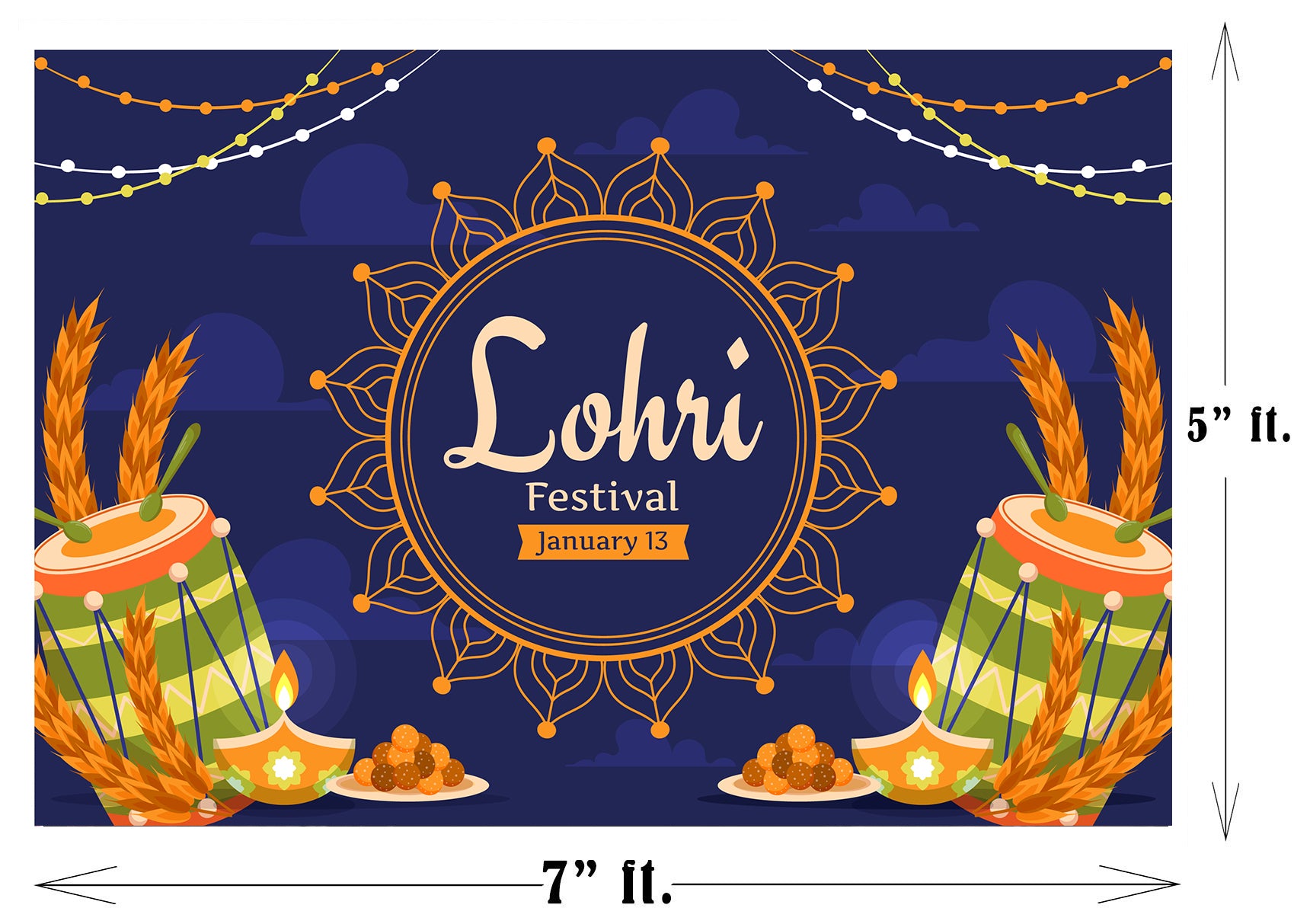 Size & Package: (Width) x (Height) 1pc Lohri Party Backdrop. To facilitate transport and packaging, items are sent folded.
