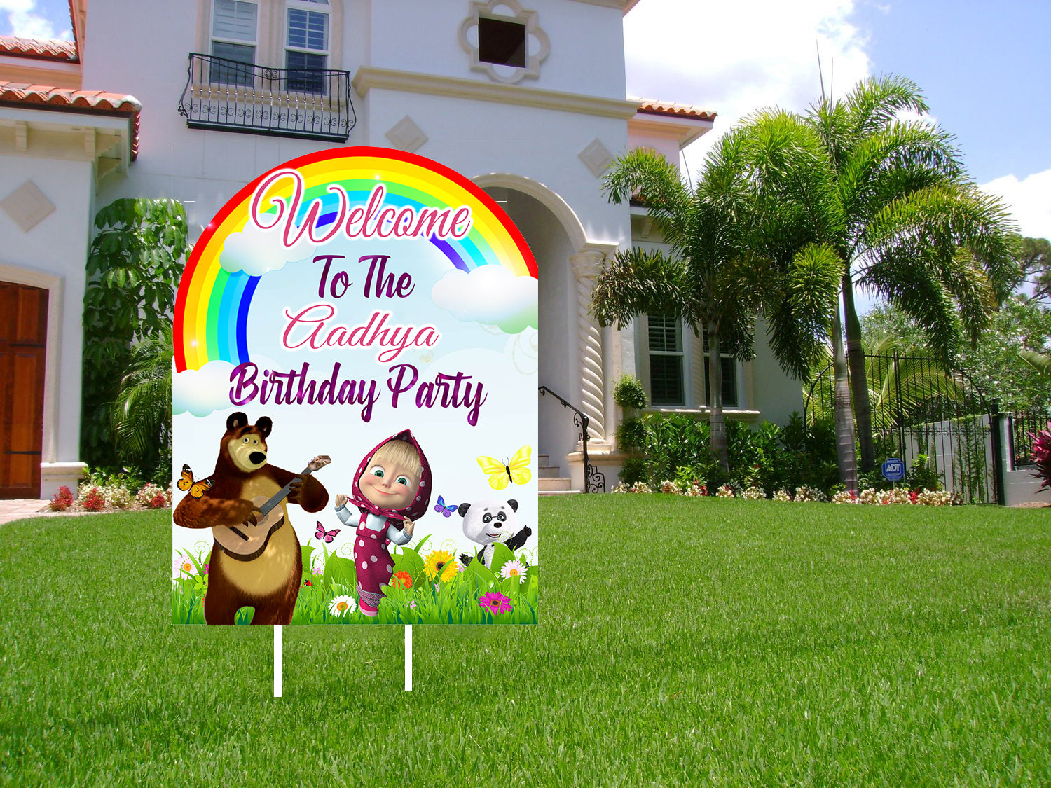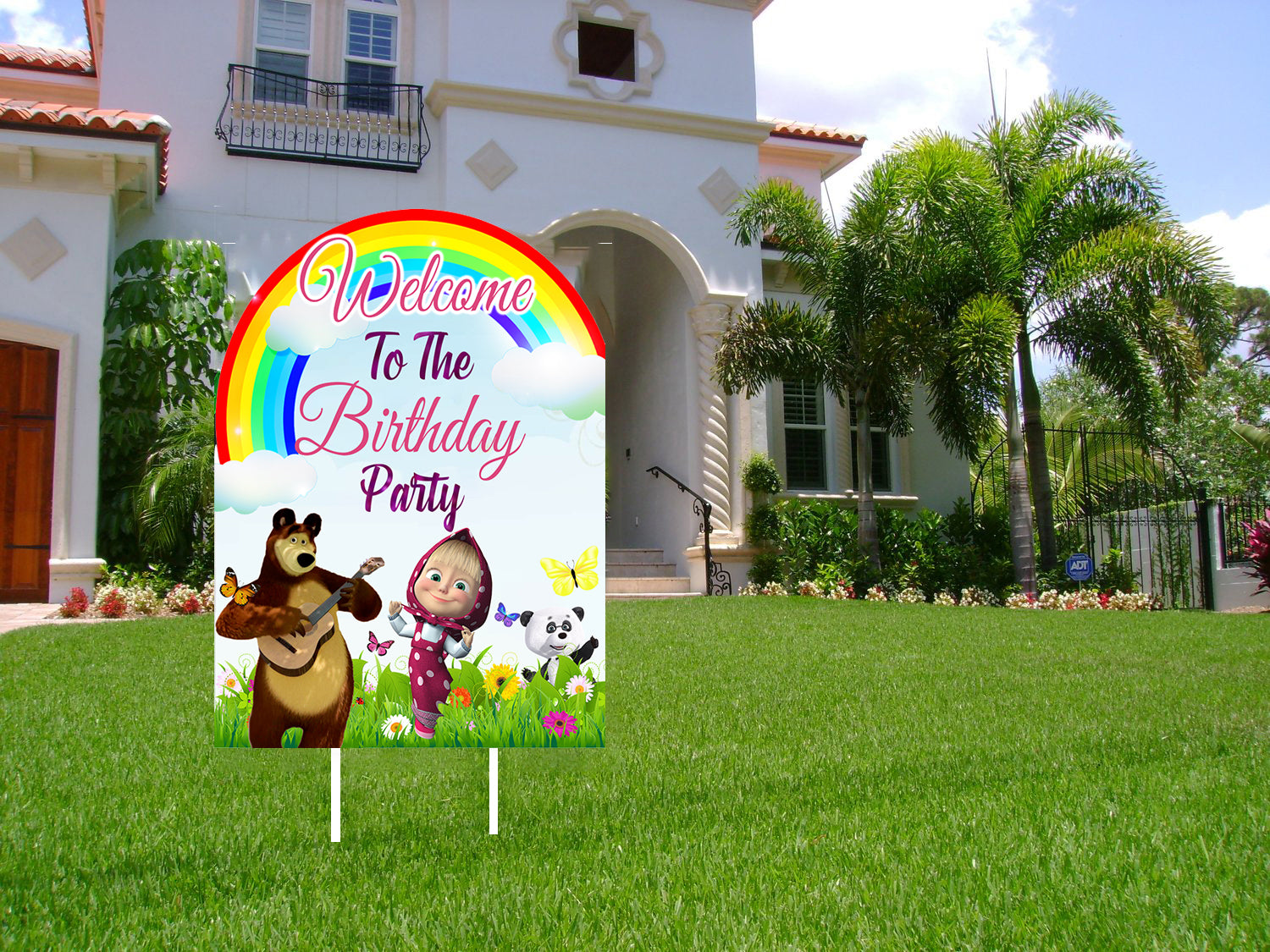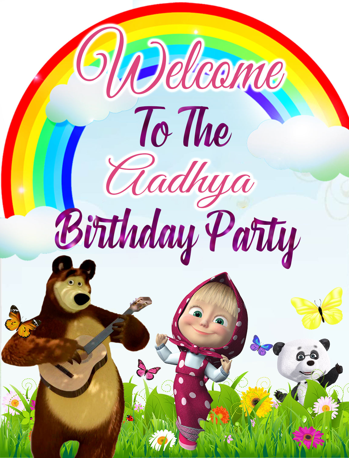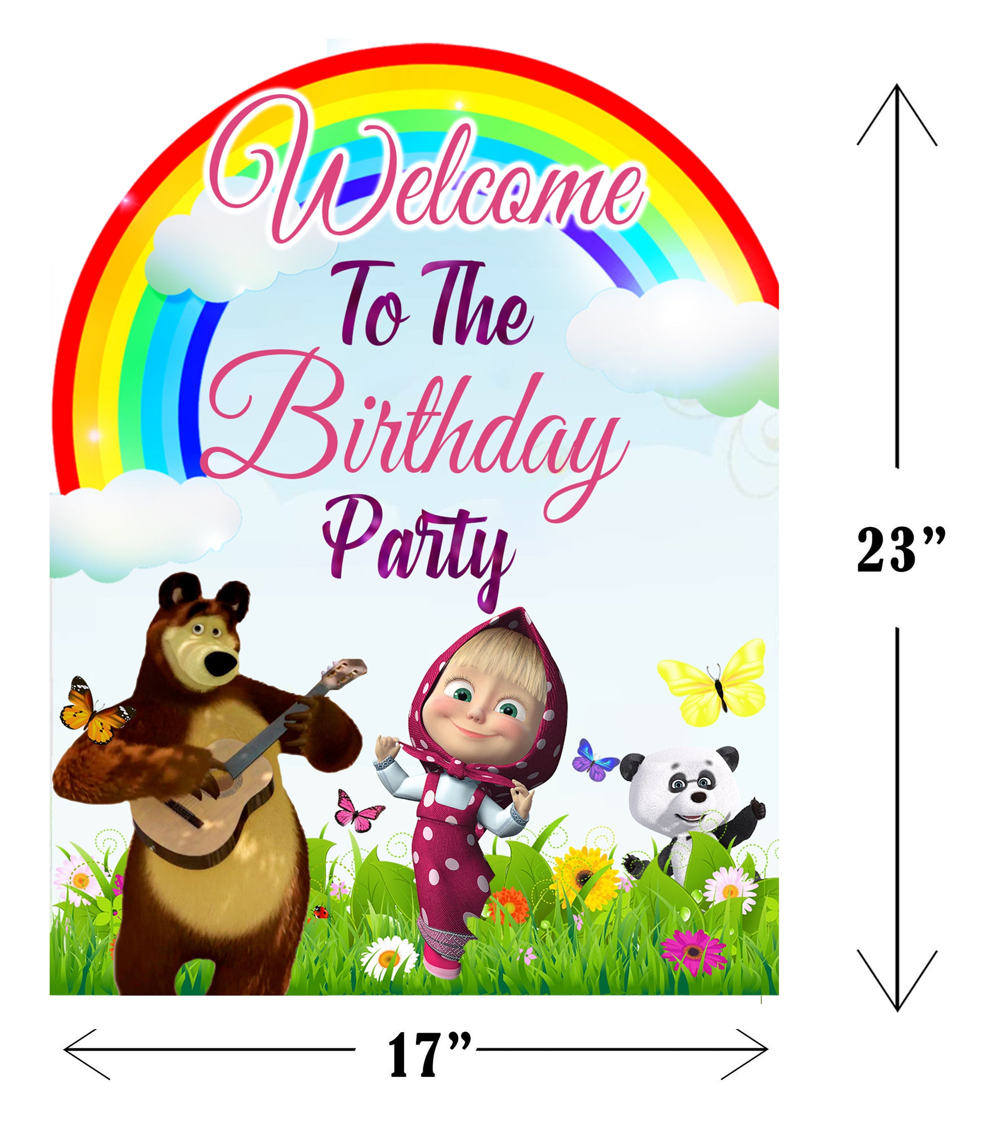- The Masha and the Bear Birthday theme Welcome board sign is ideal for any home location or outside space. Welcome your friends and family members with a stunning welcome birthday party board.