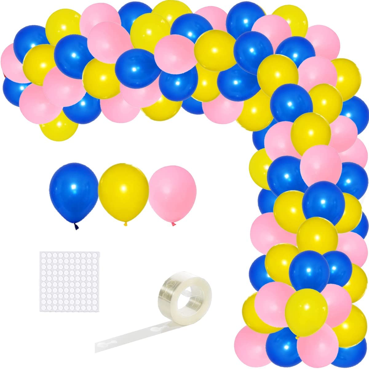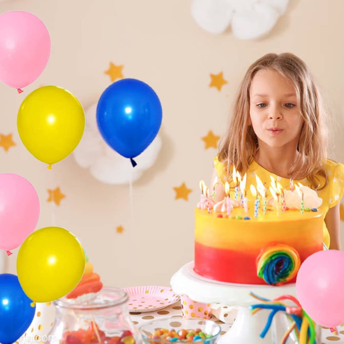 - 9 inch solid metallic pink, yellow and blue Assorted Balloons 9" Latex Balloon for Birthday Party Decorations balloons. The charming balloons are made of natural rubber latex and support helium and air.