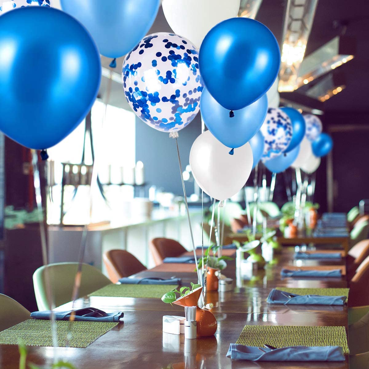 GOLDEN PACKAGE: Features 9 inch 10 Dark Blue, 10 Light Blue and 10 white Metallic latex balloons to decorate your extravagant party! Plus,12 inch 10 clear transparent balloons to insert the included shiny silver confetti. Finally, curling ribbon to tie them anywhere inside our outdoors!