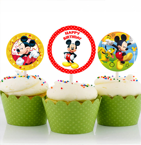 - Package Includes-12 Mickey Mouse Cupcake Toppers in 4 Different Designs. Sticks and glue dot included to assemble.