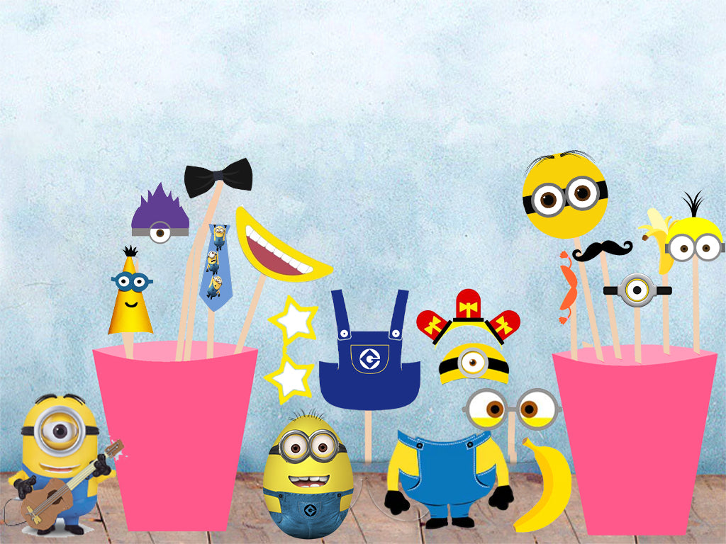 - Minnion Theme photo prop pack accompanies 20 pieces and will add fun for kids and adults. Take entertaining party photos while making memories with these photo booth props. Everyone will adore the fun photographs they will take with these excellent props.