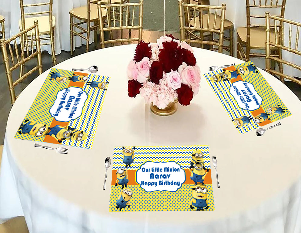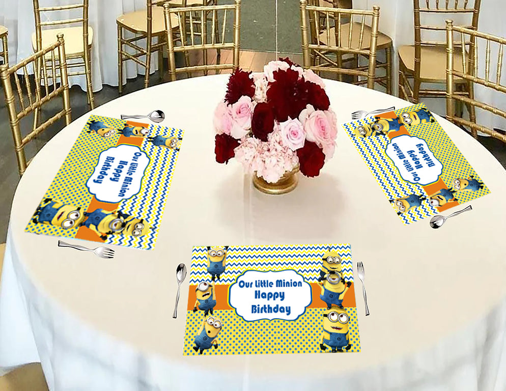 - Minnion theme birthday party table mats will delight all of your guests. Add these themed table mats to make a remarkable table setting.