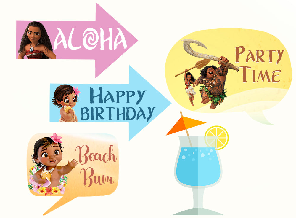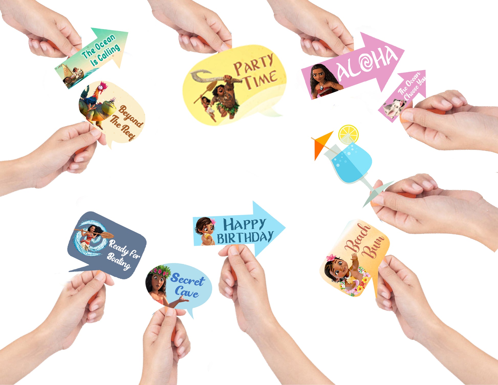- Moana Theme photo prop pack accompanies 10 pieces and will add fun for kids and adults. Take entertaining party photos while making memories with these photo booth props. Everyone will adore the fun photographs they will make with these excellent props.