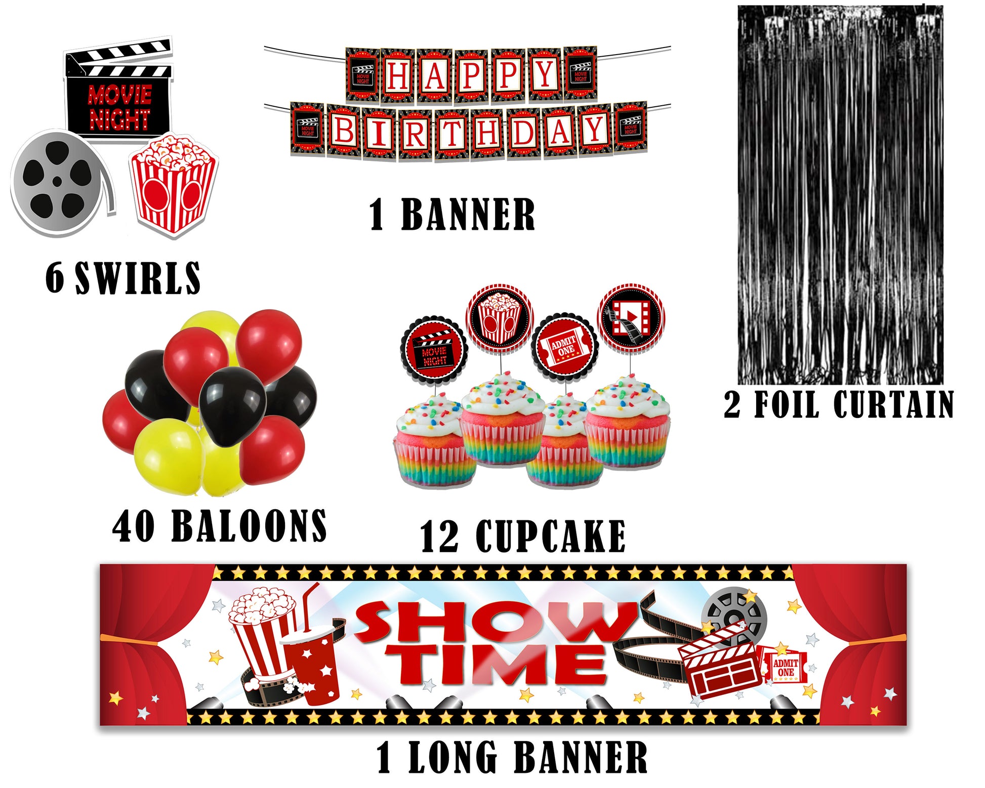 - Package Includes - 1 happy birthday letter banner, 6 pcs Swirls hangings,2 pcs Black Foil Fringe Shiny Curtain, 40 pcs Latex Balloons-Black, Yellow, Red, 12 cupcake topper and long banner. All of the kits are useful for Birthday Party decorations.