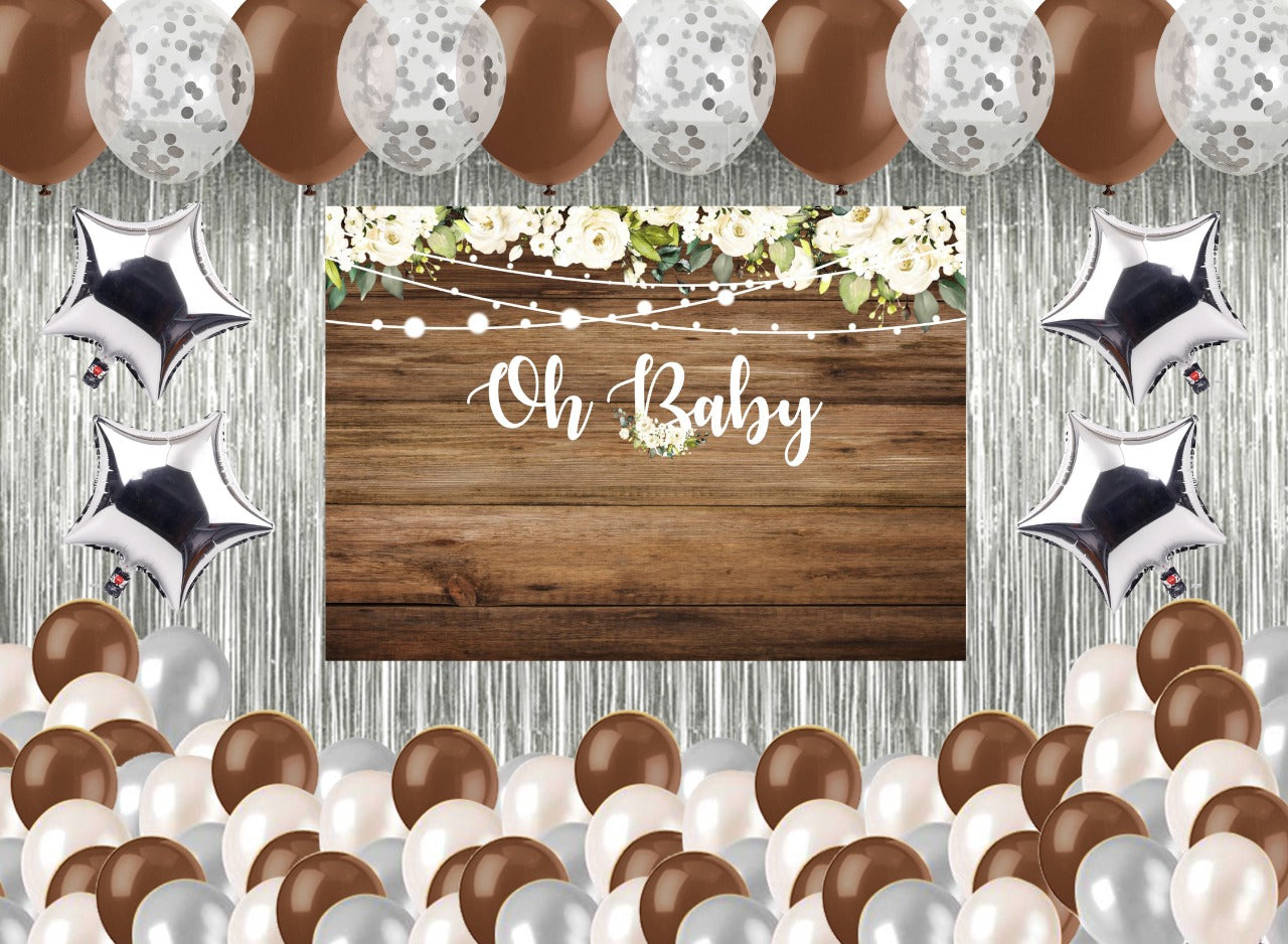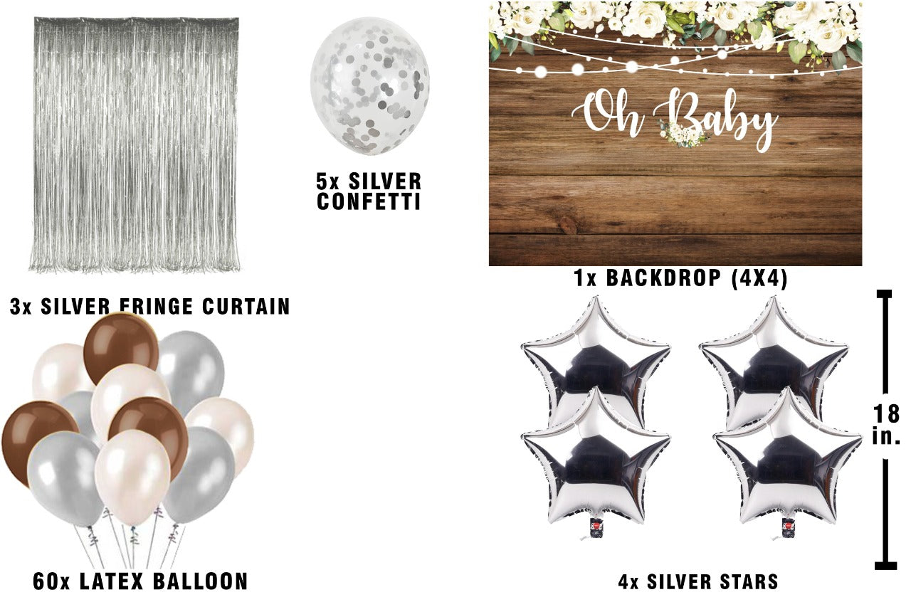 - Package Includes -3 Pcs Silver Fringe Curtains, Backdrop - 4 by 4 ft, 60 pc Latex balloons (brown white and silver), five pc silver confetti, 4 silver star