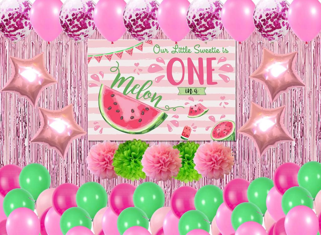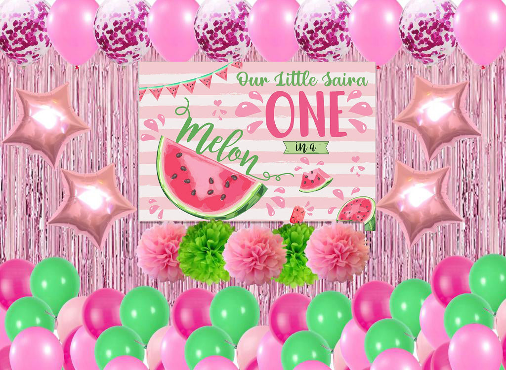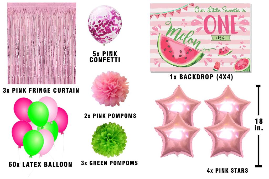 Package Includes - 3 Pcs pink Fringe curtains; 1 First birthday backdrop- Size 4 by 4 ft, 60 pc latex balloons (light pink, dark pink ,green- 20 each); 5 pc pink confetti, 4 pink star 18"inch and 5 Pom Pom total -2 pink and 3 green.