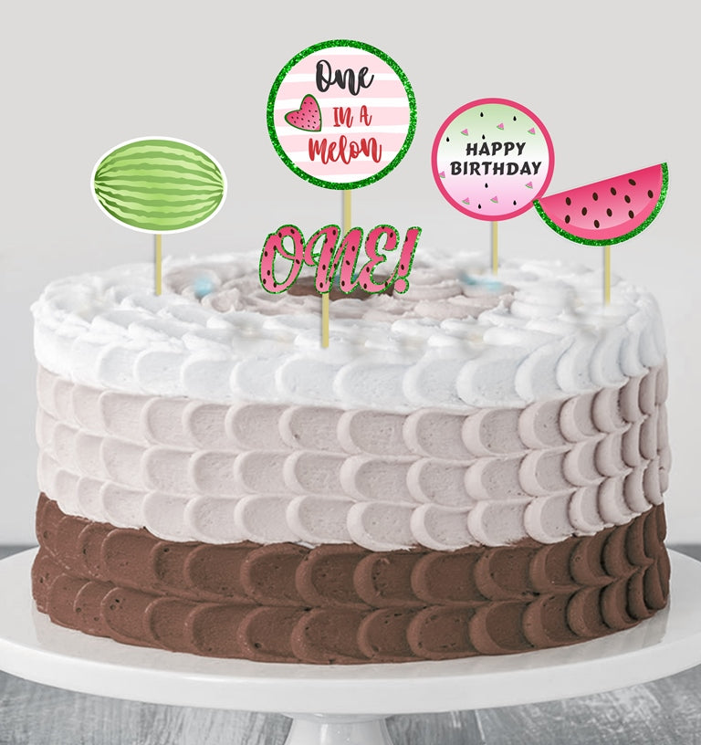 - How to use: - Include One In A Melon Theme Cake toppers to your treat table to make an extraordinary theme cake show. Style the big cake topper with the two huge picks and add one small selection to each of the ten cut-out shapes to finish the cake embellishment.