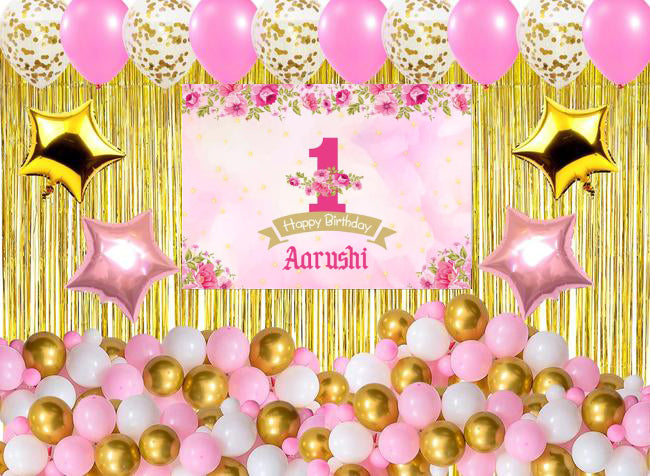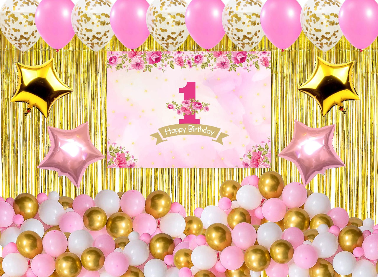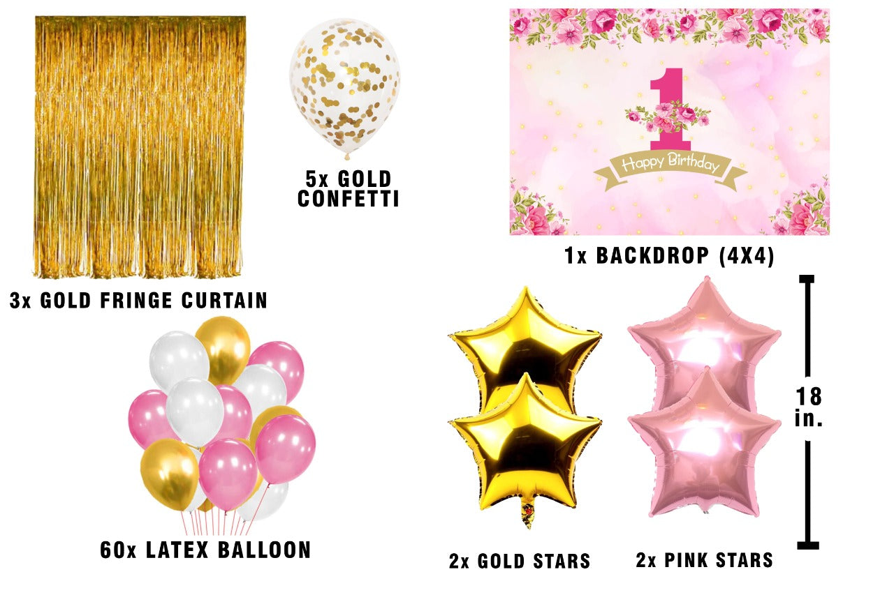 Package Includes -3 Pcs Gold Fringe curtains; 1 First birthday backdrop- Size 4 by 4 ft .60 pc latex balloons (pink, gold and white -20 each); 5 pc gold confetti ,2 star gold and 2 pink star 18"inch .