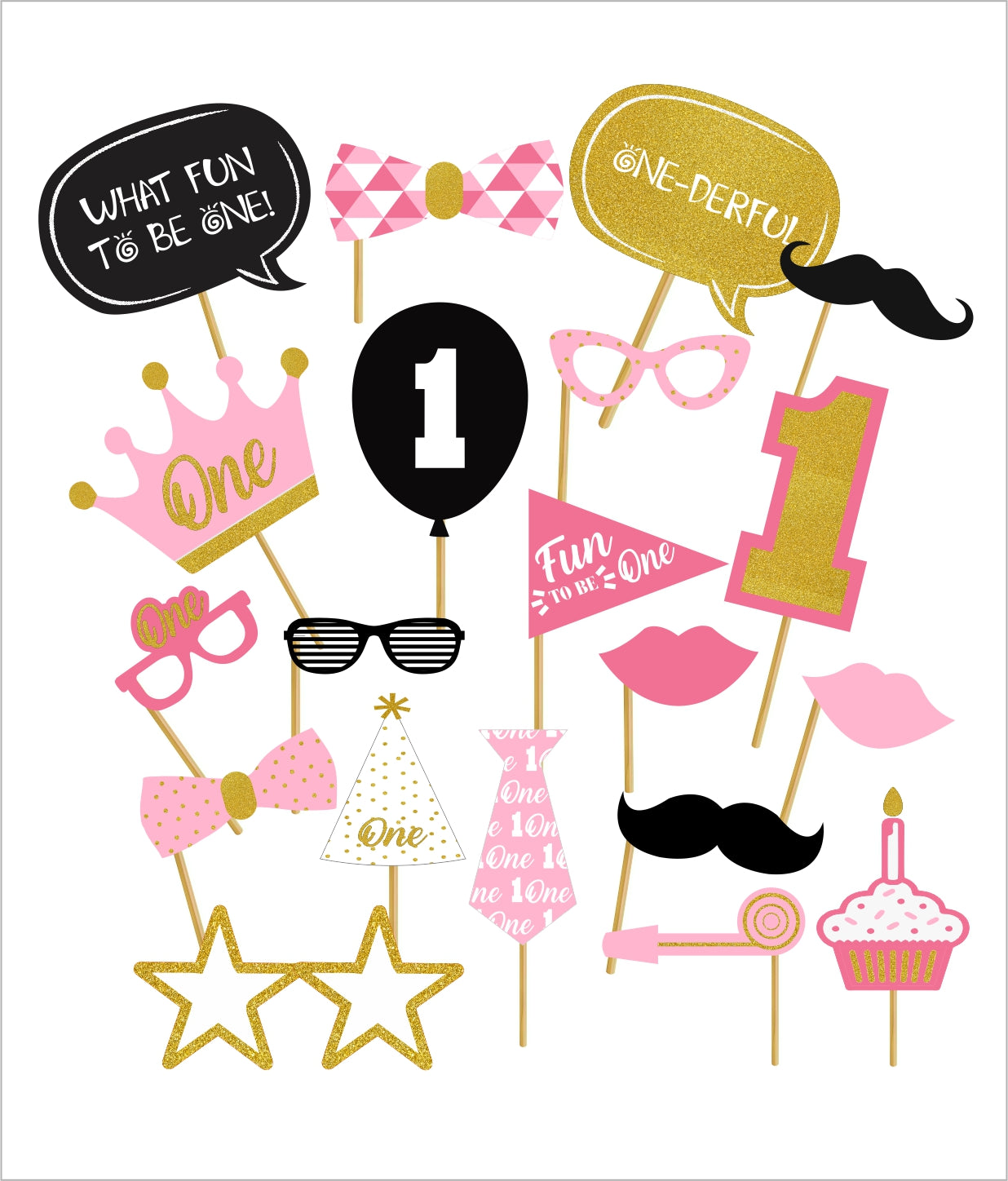 - First Birthday Theme photo prop pack accompanies 20 pieces and will add fun for kids and adults. Take entertaining party photos while making memories with these photo booth props. Everyone will adore the fun photographs they will take with these excellent props.