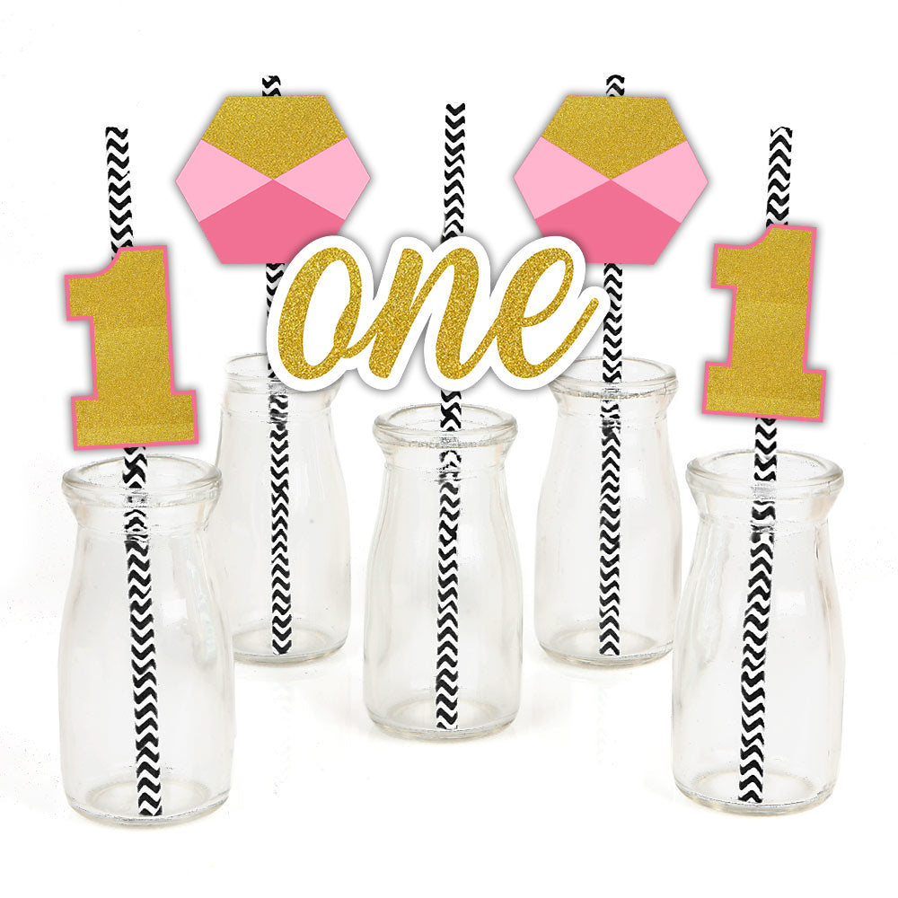 - The package includes - 24 First Birthday theme paper cut-outs, 25 coordinating paper straws & a glue dot.