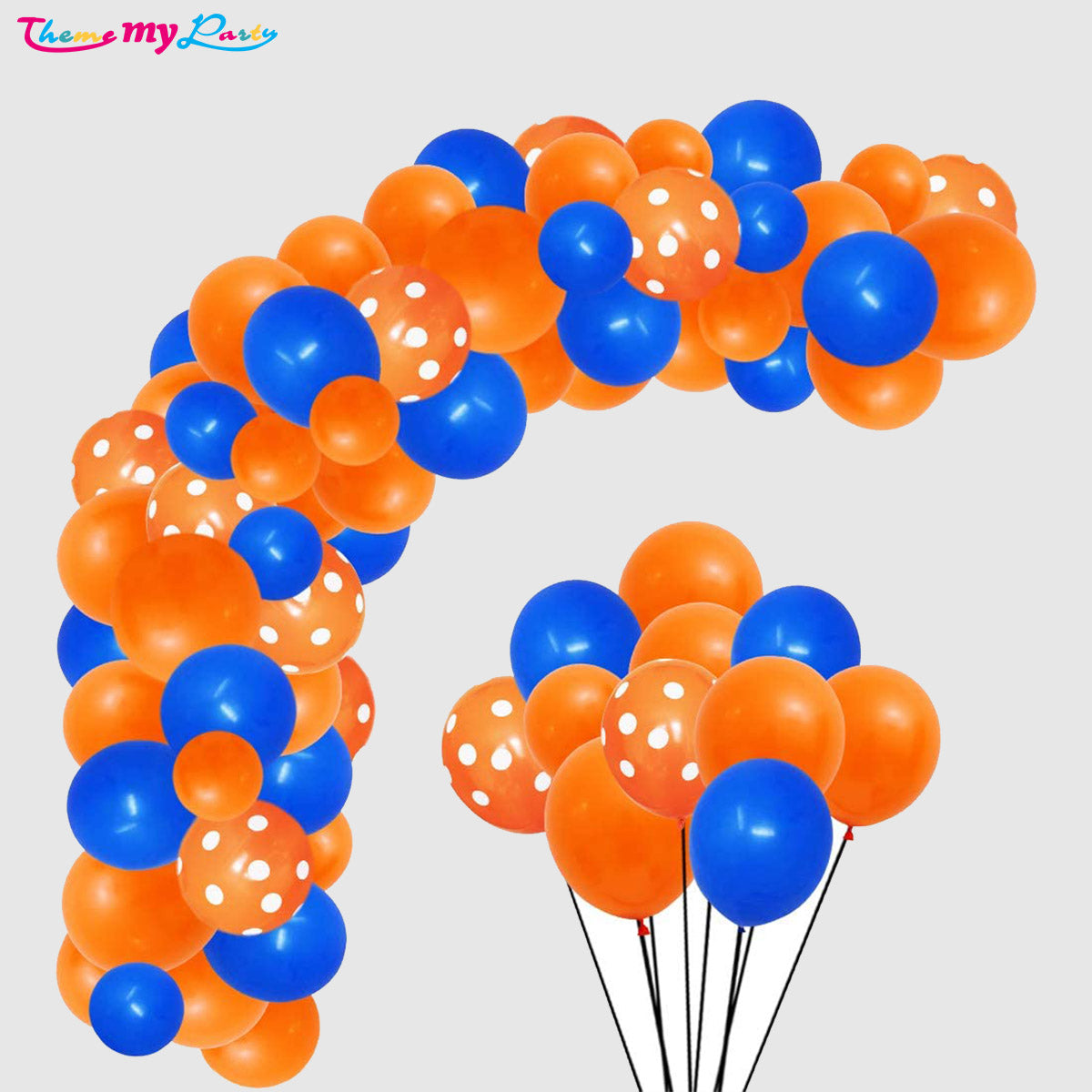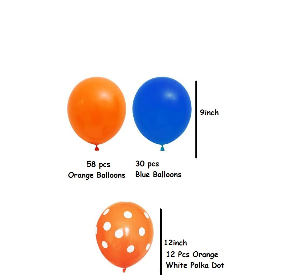 - PACKAGE INCLUDED: 100pcs latex balloons. 30pcs 9'' blue Balloons, 58pcs 9'' orange Balloons, 12pcs 12'' orange White Polka Dot Balloons, 16ft balloons arch strip.