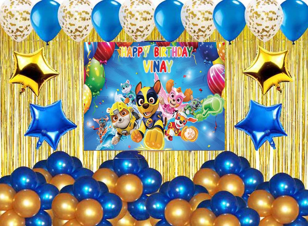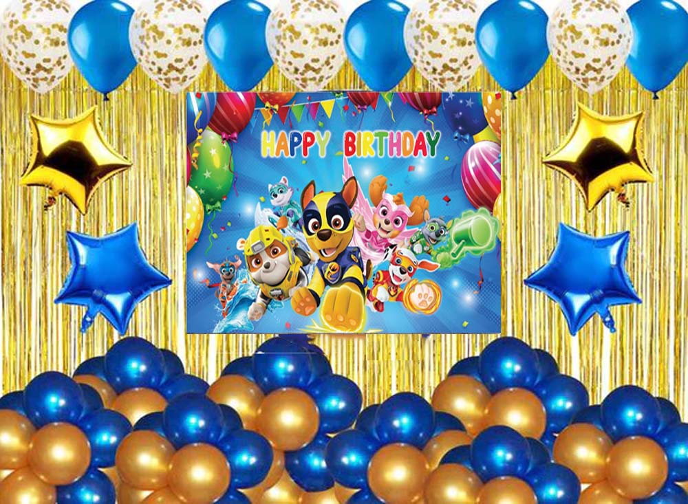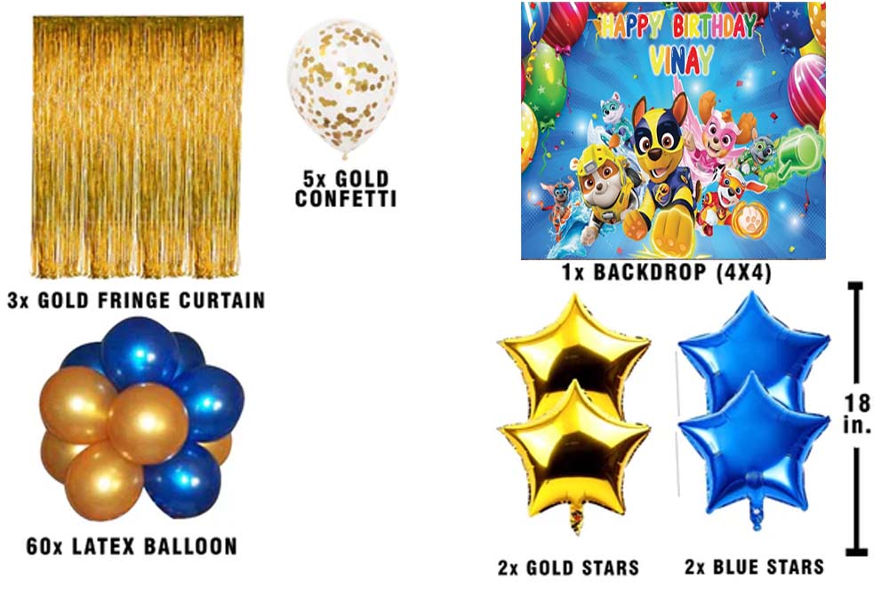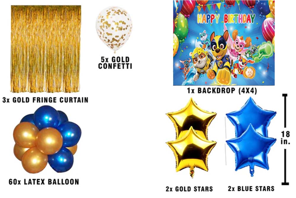 - Package Includes -2 Pcs Gold Fringe curtains; 1 Paw Patrol birthday backdrop- Size 4 by 4 ft. 60 pc latex balloons (Golden and Blue - 30 each); 5 pc gold confetti ,2-star gold and 2 Blue star 18"inch.