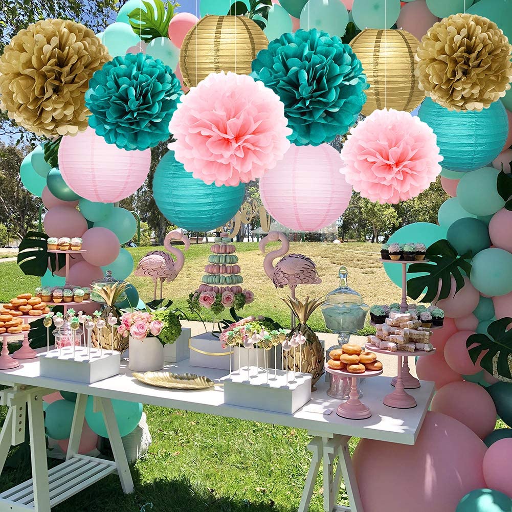 Set of 12 Pink,Green and Gold Tissue Paper Pom Pom Paper Lantern Birthday Party Baby Shower Decorations