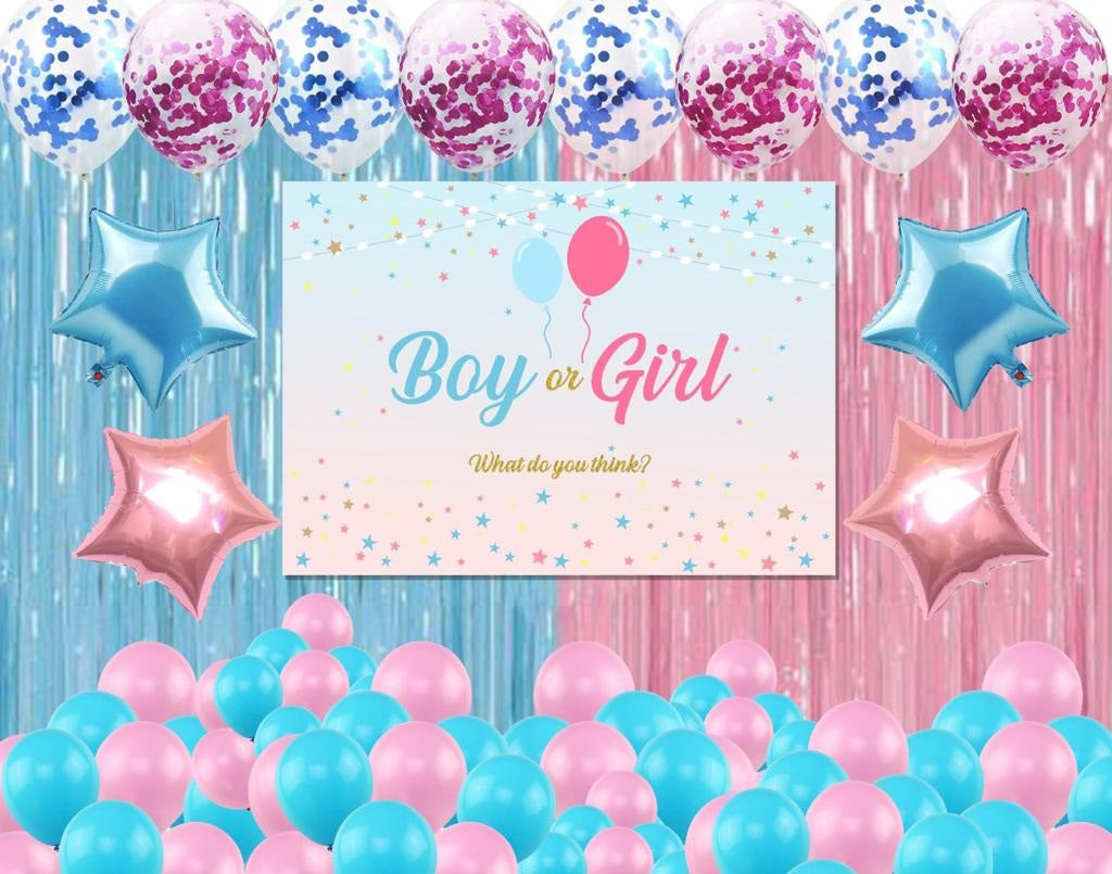 - Package Includes -3 Pcs Blue Fringe Curtains, Backdrop - 4 by 4 ft, 60 pc Latex balloons (light blue, dark blue, green pastel, and white -15 each), five pc silver confetti, two silver star and two blue stars 18" inch each and 5 Pompom-White and Blue.