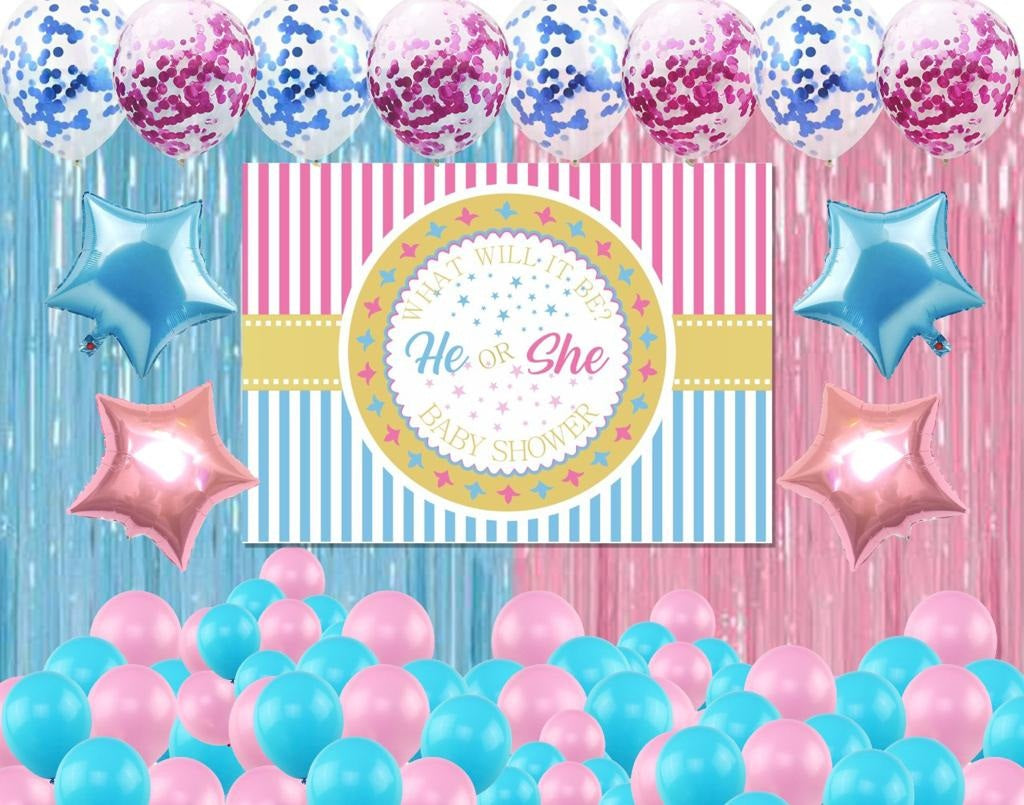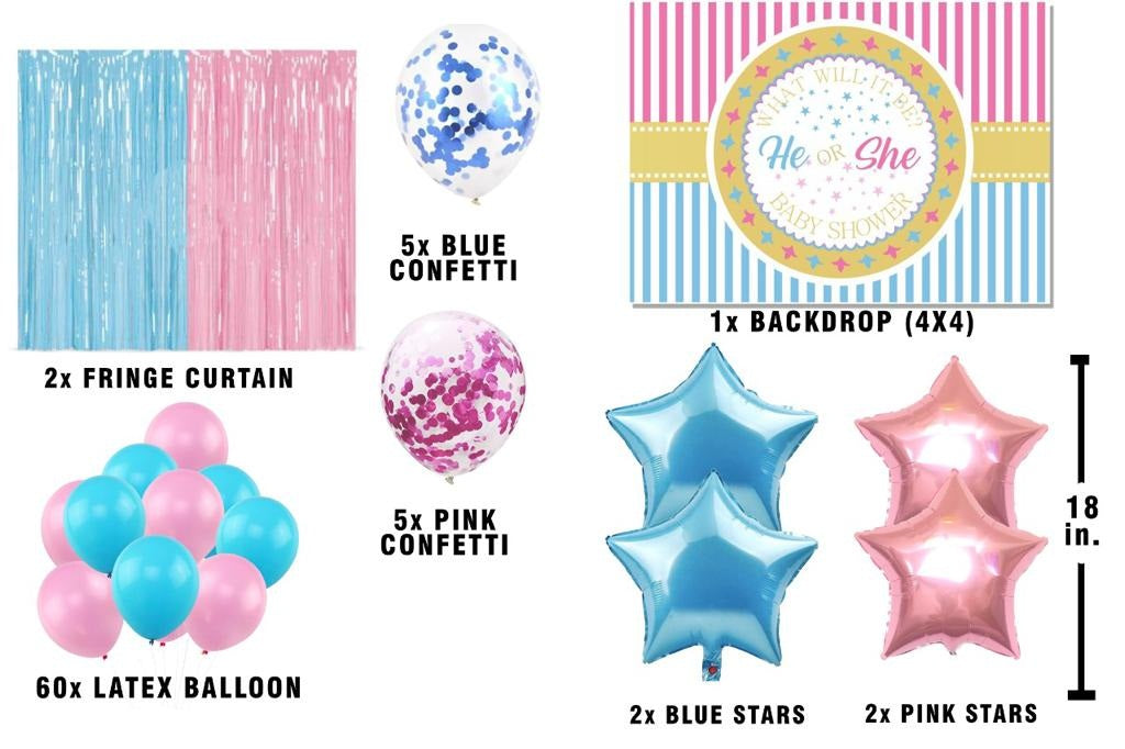 - Package Includes -3 Pcs Blue Fringe Curtains, Backdrop - 4 by 4 ft, 60 pc Latex balloons (light blue, dark blue, green pastel, and white -15 each), five pc silver confetti, two silver star and two blue stars 18" inch each and 5 Pompom-White and Blue.