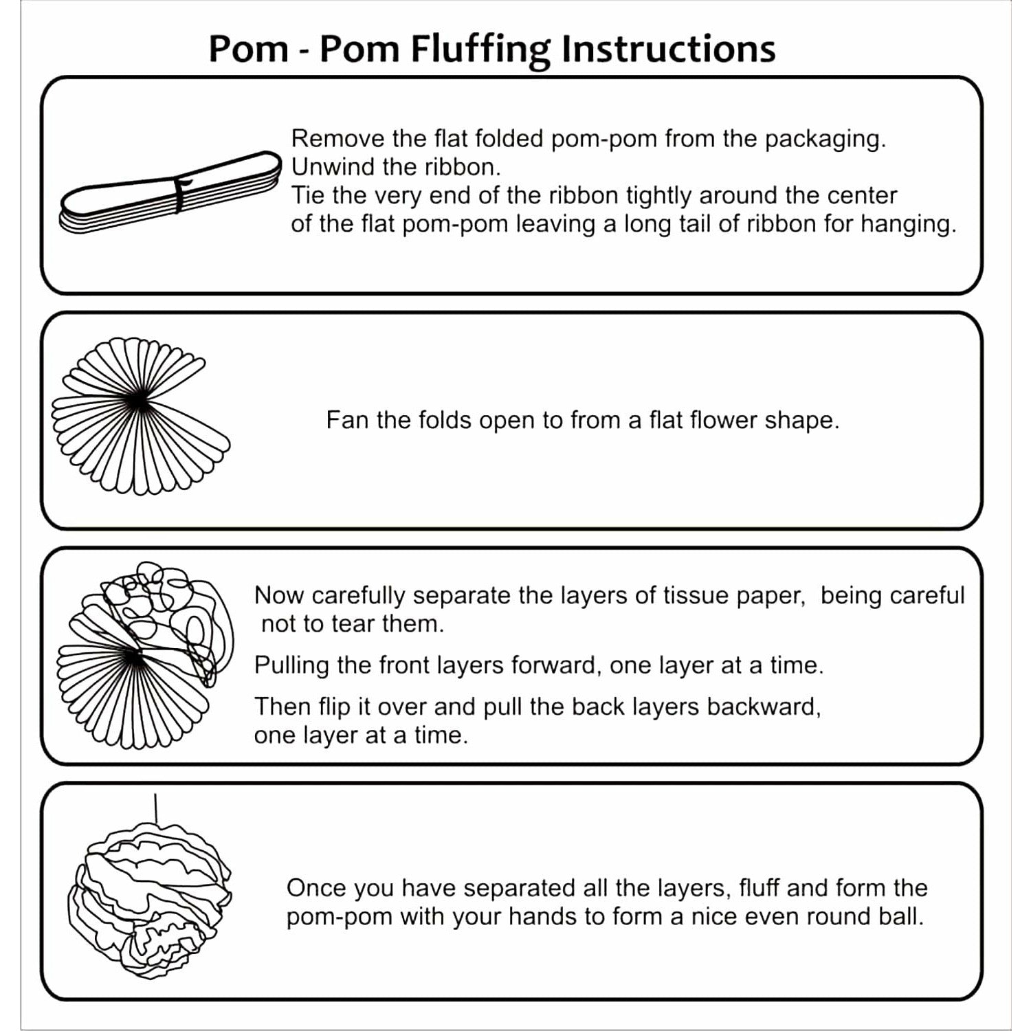 - Tissue pom poms come flat, pre-folded and pre-cut, just follow our instruction to assemble it step by step. Easy to fluff and use. Just enjoy the DIY fun with bright, eye-catching colors that babies love.