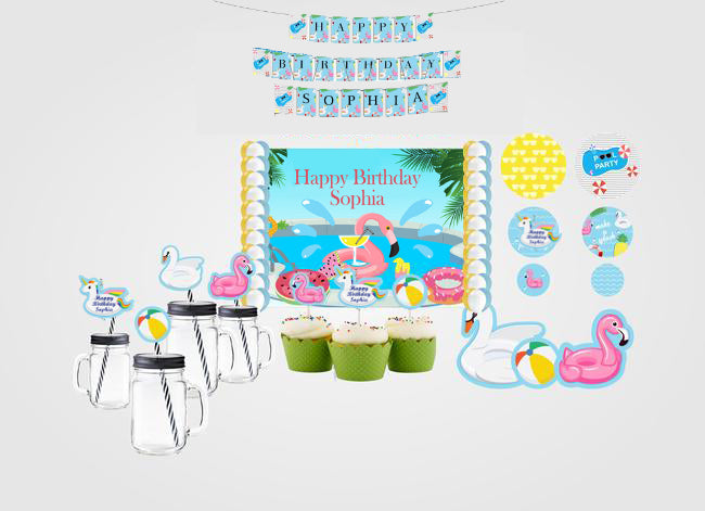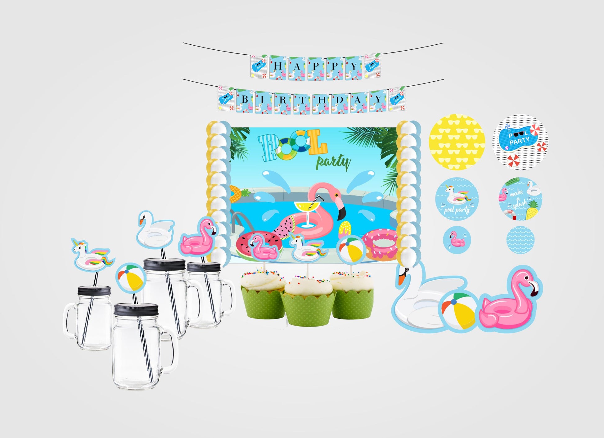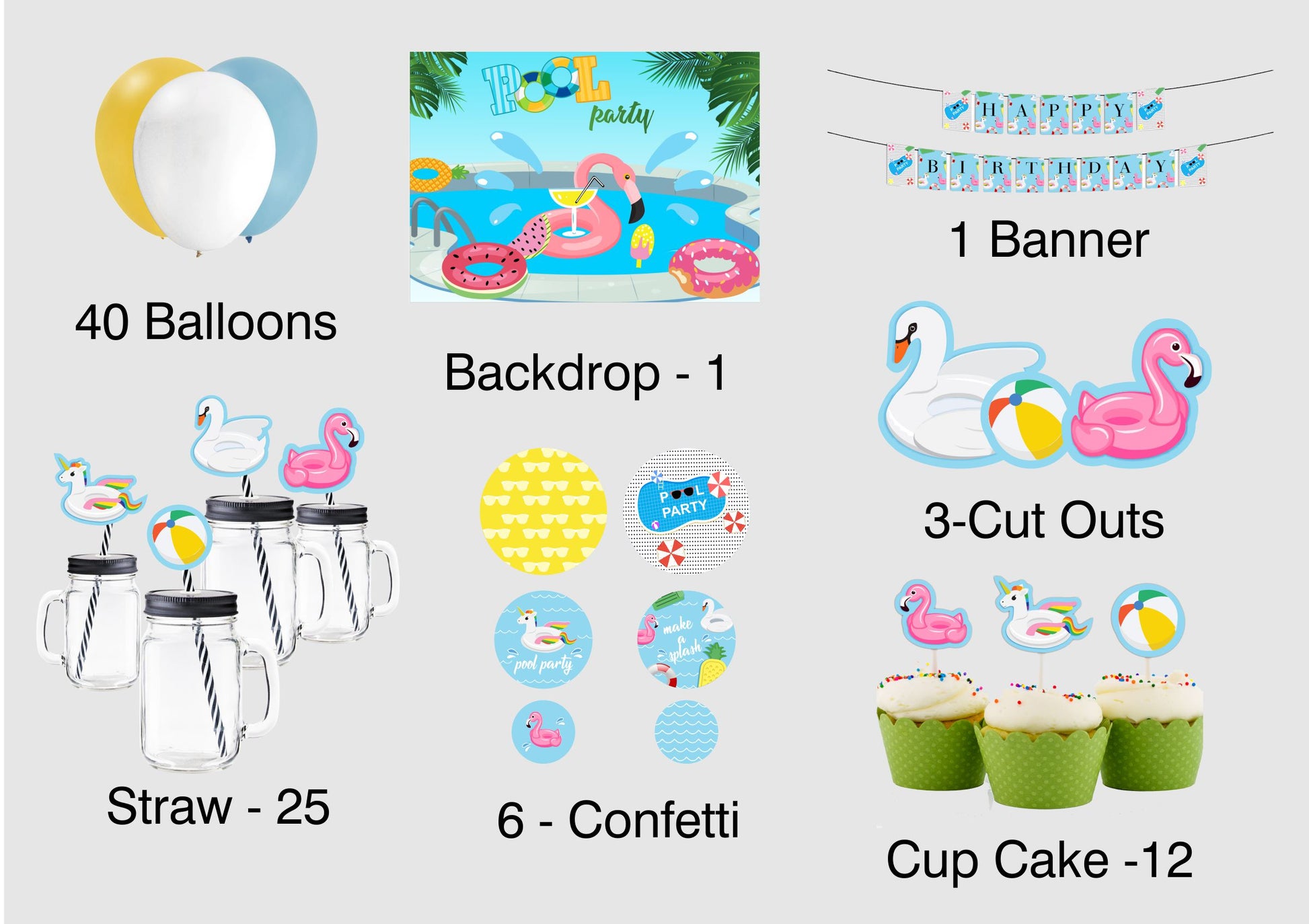 - PACKAGE -Pool Party themed birthday party supplies kit included Backdrop-flex material light and thin , Balloons- 40 pcs Latex gold quality 13 each yellow ,blue and White, 1 Banner Happy Birthday,3 Cutouts Theme Based, 25 Straw ,6 Confetti and 12 Cup Cake all theme Based All of the kit is useful for birthday party.