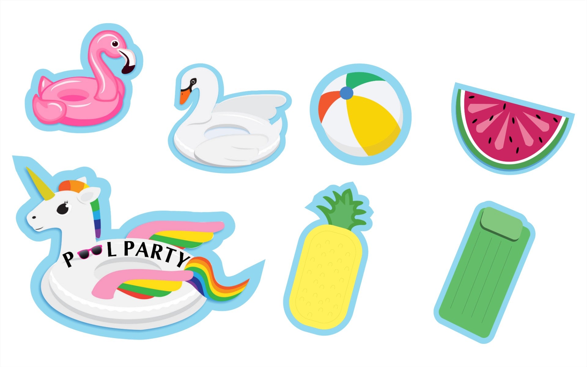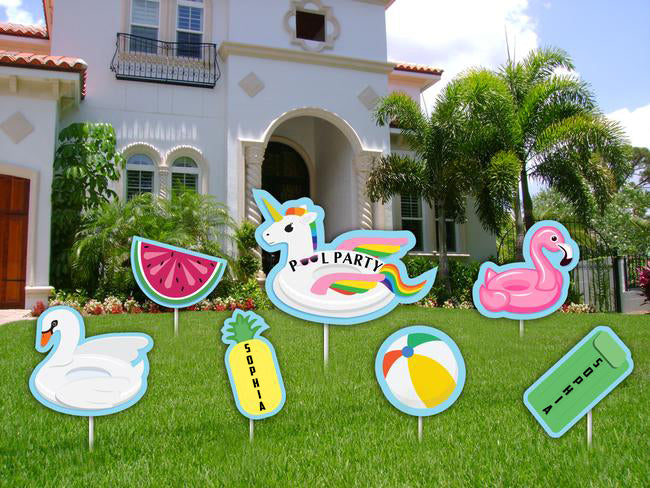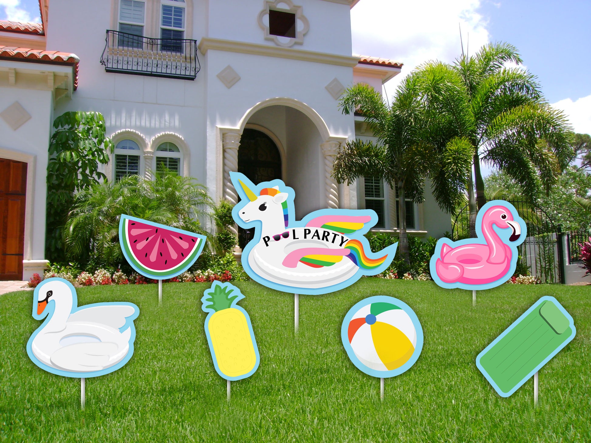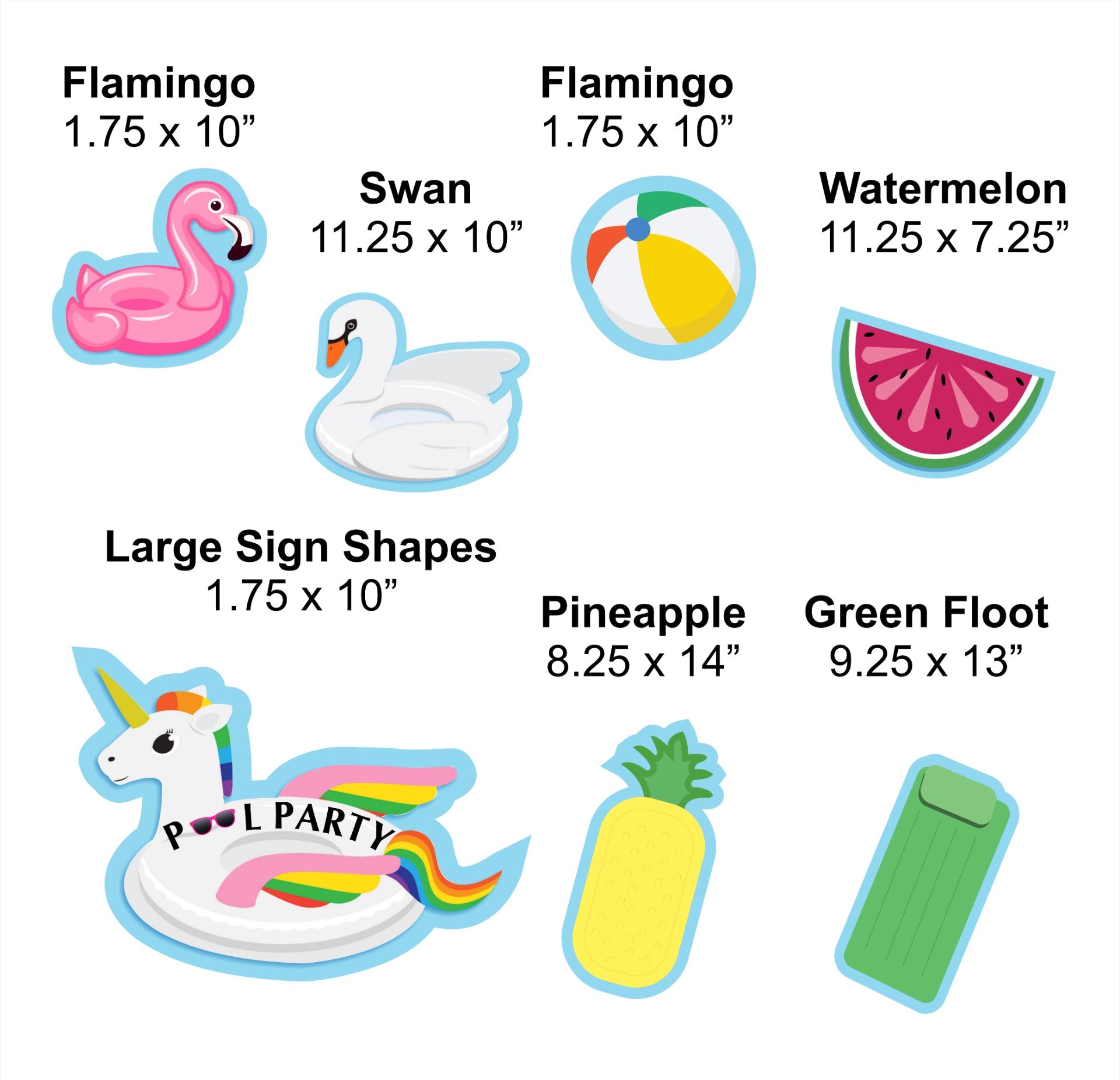 - Package Includes: - 4 Pool Party theme different pattern cut-outs with different sizes varies between 1ft -2ft approx.