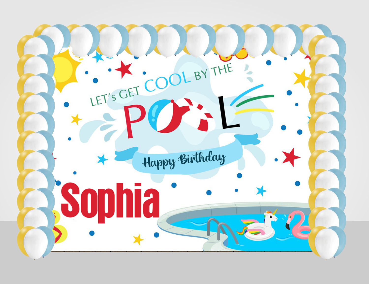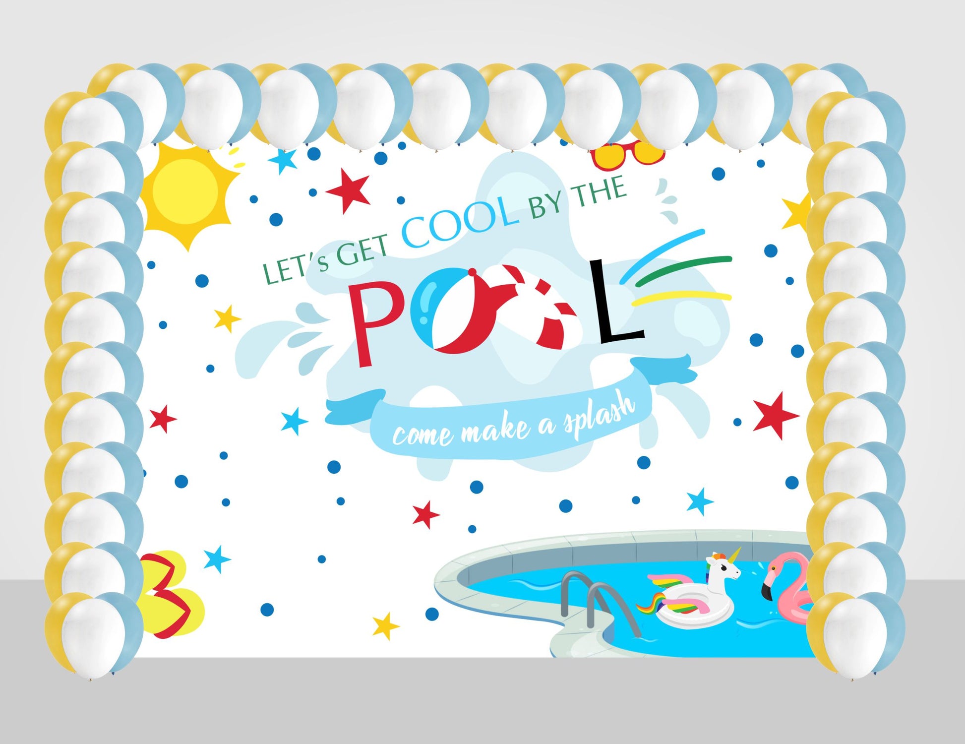 Package Includes - Pool Party Birthday Theme Backdrop & Balloons. Total 50 balloons, 17 each -White, Yellow and Blue.