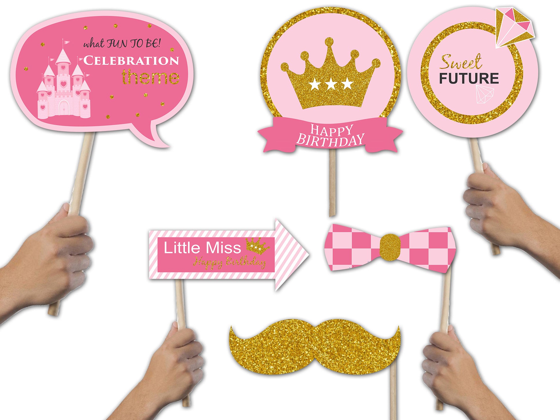 - Princess Birthday Theme photo prop pack accompanies 20 pieces and will add fun for kids and adults. Take entertaining party photos while making memories with these photo booth props. Everyone will adore the fun photographs they will take with these excellent props.