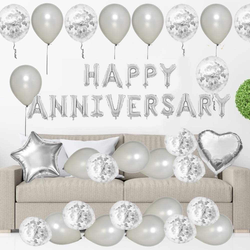 - PERFECT ANNIVERSARY DAY DECORATION KIT - Silver party decoration contains: 18 inches silver five-pointed star x 2, Heart balloons x 2, 16 inches Happy Anniversary balloons x 1, 12 inches sequin balloons x 8, 9 inch latex balloon x 20