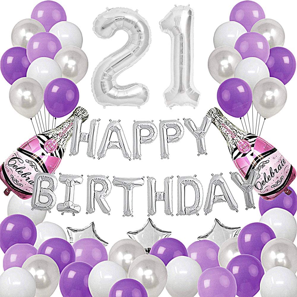PACKAGE INCLUDE: 1 set "HAPPY BIRTHDAY" silver foil banner-16inch, 2 colorful champagne bottle balloons-40inch,3pcs foil star-18inch, 8pcs latex balloons-9inch, 12pcs purple, 9pcs white and 11pcs silver each-9inch, 2pcs silver foil numbers balloons 2 and 1,each-16inch.