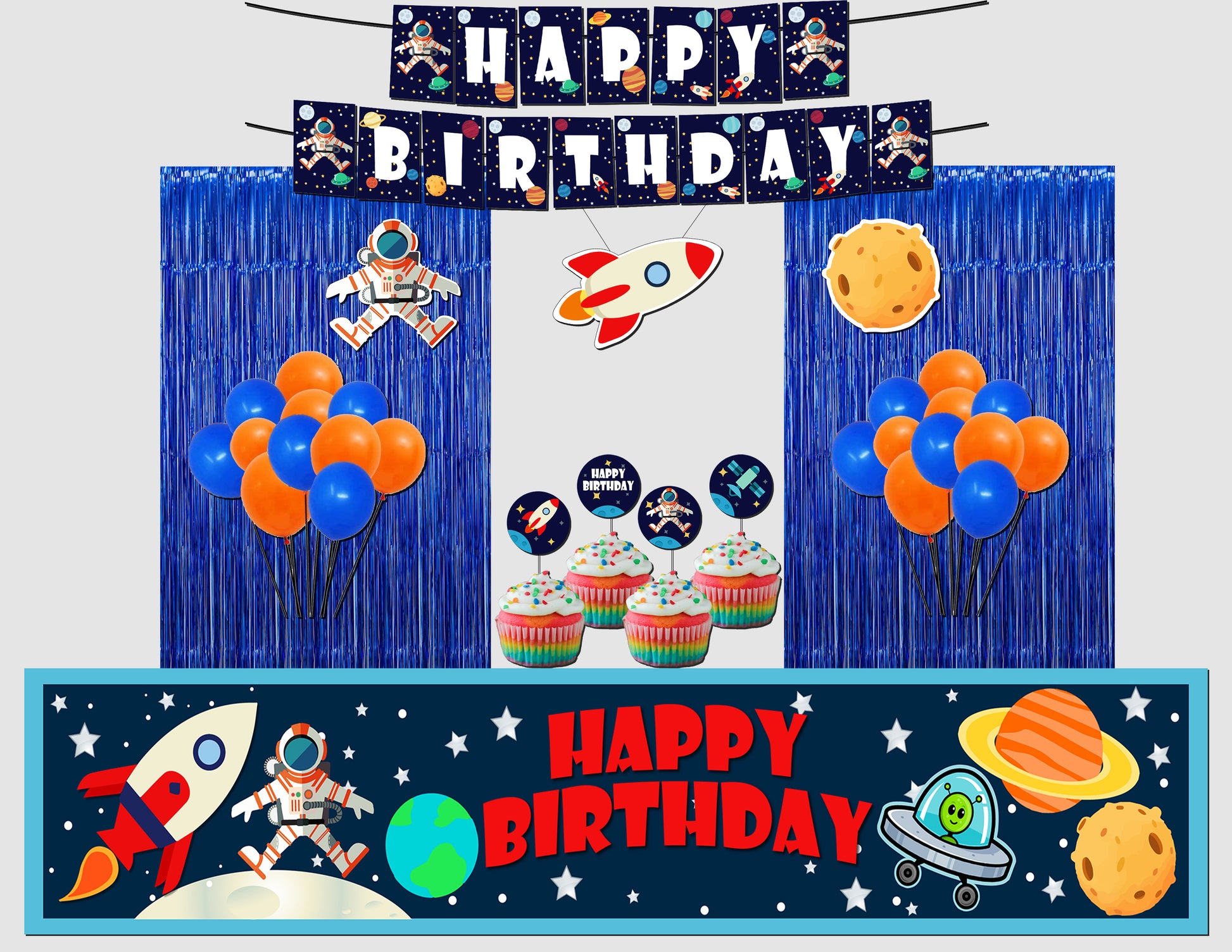 Package Includes - 1 happy birthday letter banner, 6 pcs Swirls hangings,2 pcs Blue Foil Fringe Shiny Curtain, 40 pcs Latex Balloons-Orange and Blue,12 cupcake topper and long banner. All of the kits are useful for Space Party decorations.