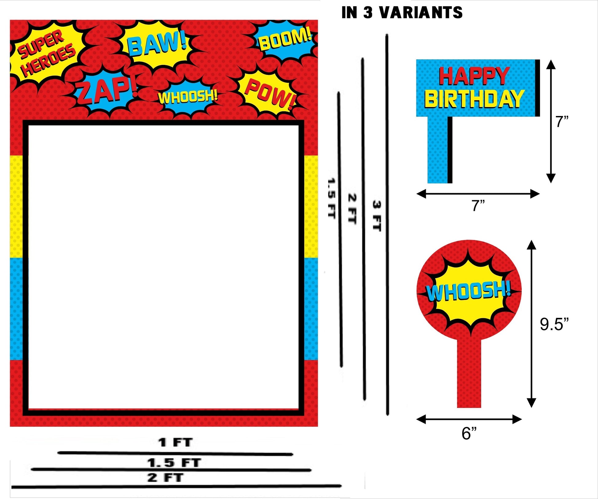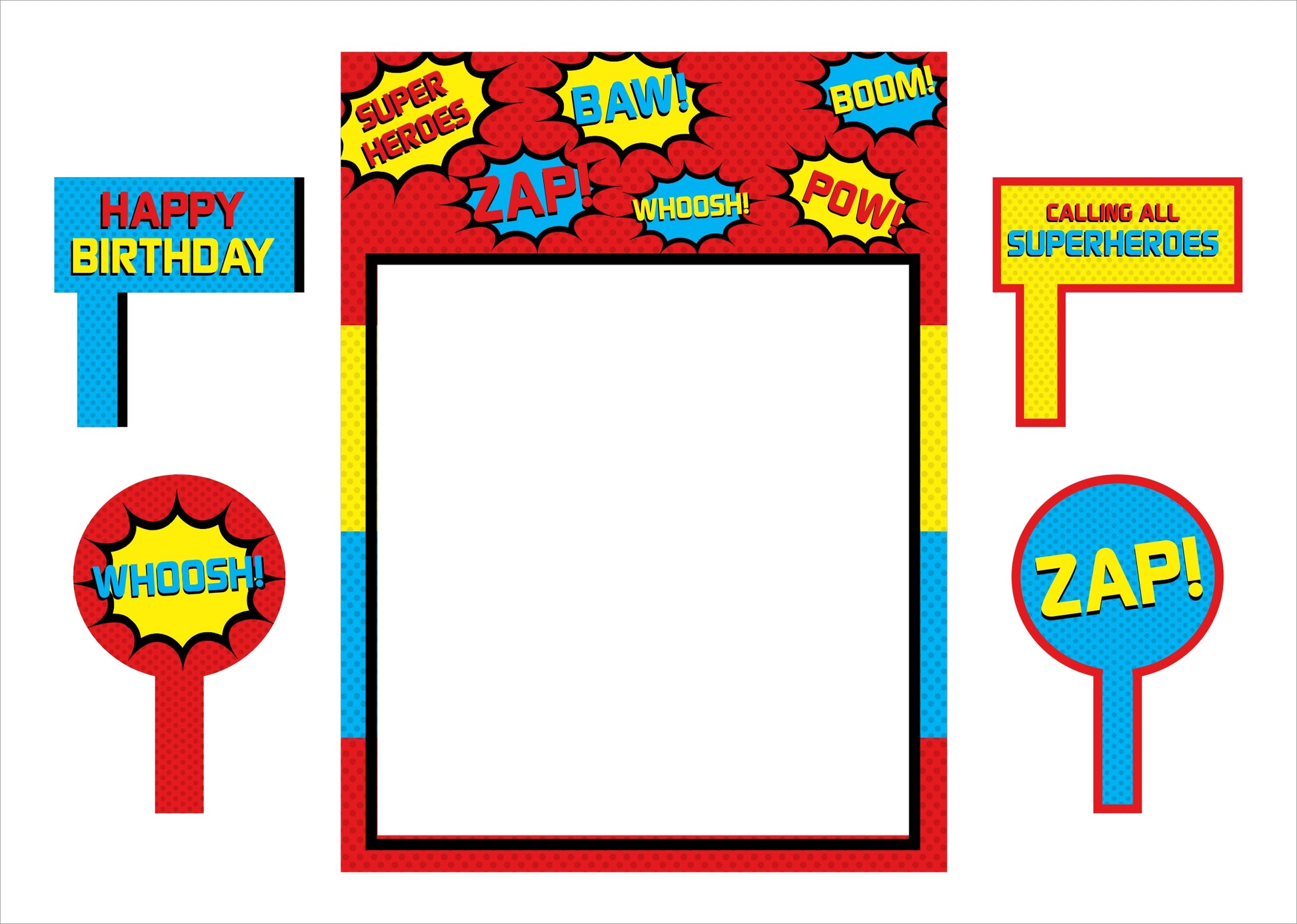 - Take fun gathering pics with a Super Hero theme Photo Frame and Props. Each photo-op prop unit is imprinted on substantial plastic to withstand a wide range of festivities. Accumulate your companions and posture with a photo booth. Everybody will need to get in on the fun as they take photographs with this Super Hero Party Photo booth and Props.