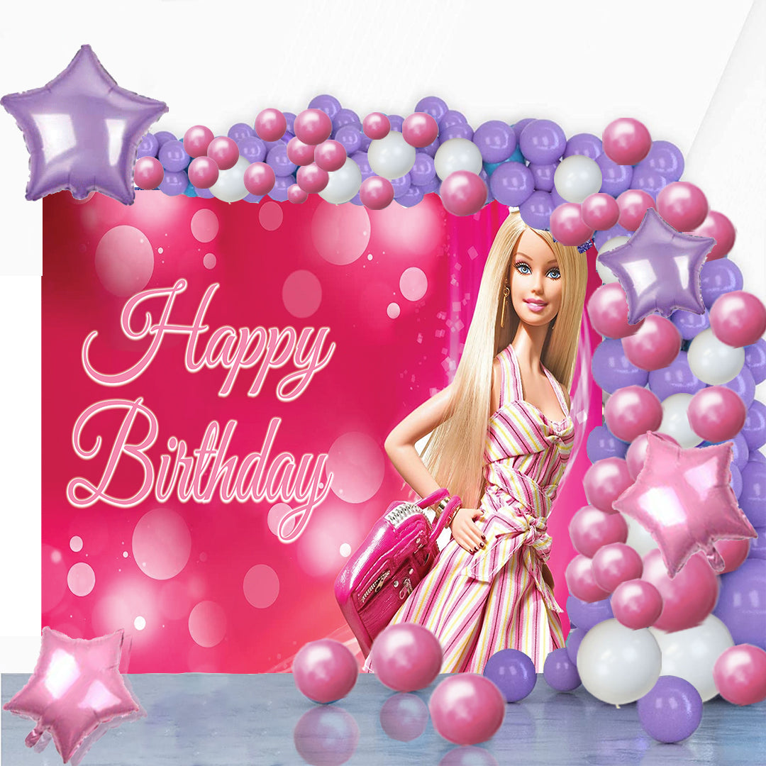 - PACKAGE: The decorations set includes: 4ft x 4ft backdrop banner made of high quality star flex, 40 Latex Balloons Pink & Purple, 5 pcs White Balloons.