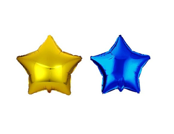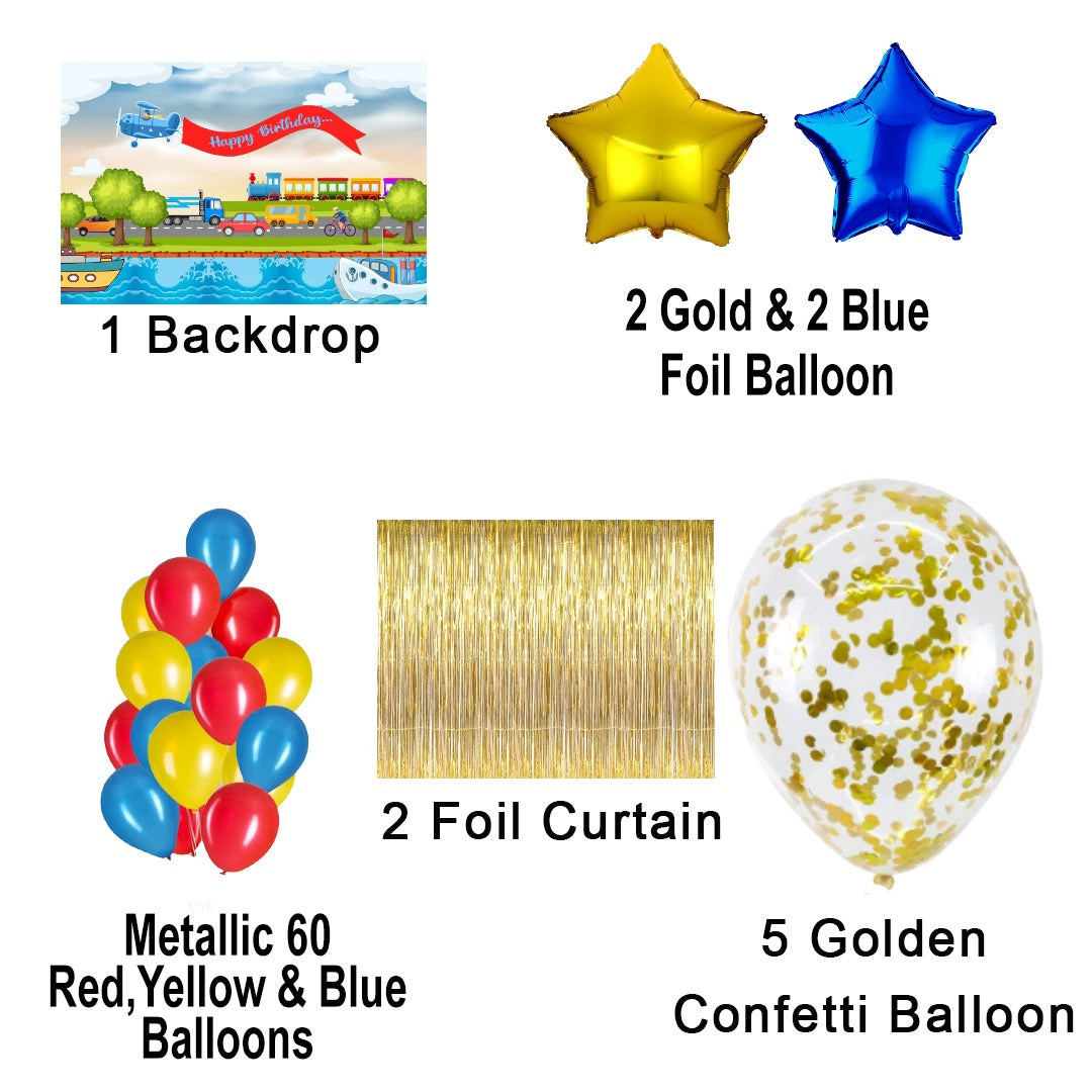 PACKAGE: 2pcs gold Fringe curtains; 1 birthday backdrop- Size 4 by 4 ft, 60 pc latex balloons (Red + yellow +blue Balloons - 15 each); 5 pc Gold Confetti , 4 pcs - 2 gold and 2 blue star foil Balloons- 18 inch.