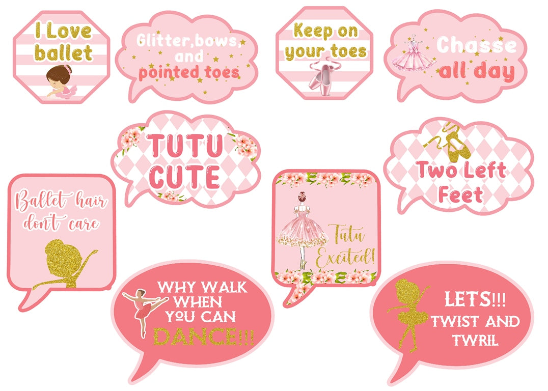 - Ballerina Theme photo prop pack accompanies ten pieces and will add fun for kids and adults. Take entertaining party photos while making memories with these photo booth props. Everyone will adore the fun photographs they will make with these excellent props.