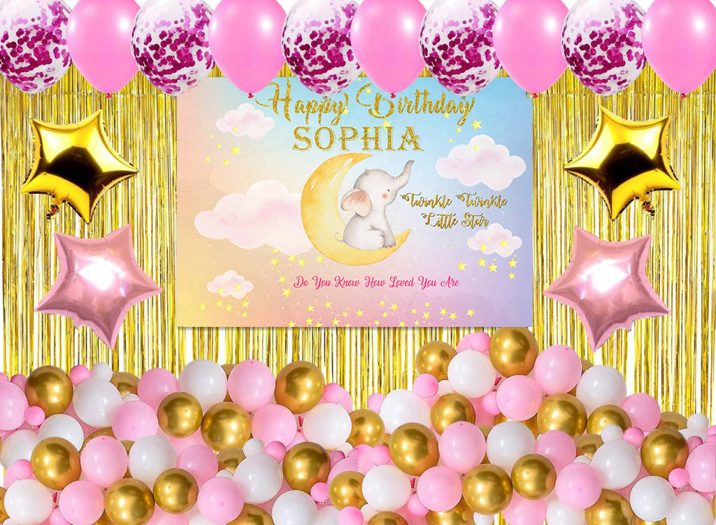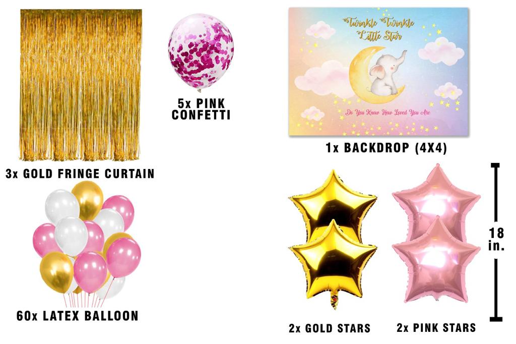 - Package Includes : 3 Pcs gold Fringe curtains; 1 First birthday backdrop- Size 4ft by 4ft, 60 pc latex balloons (pink, white and gold - 20 each); 5 pc pink confetti , 2 gold star and 2 pink star 18"inch.