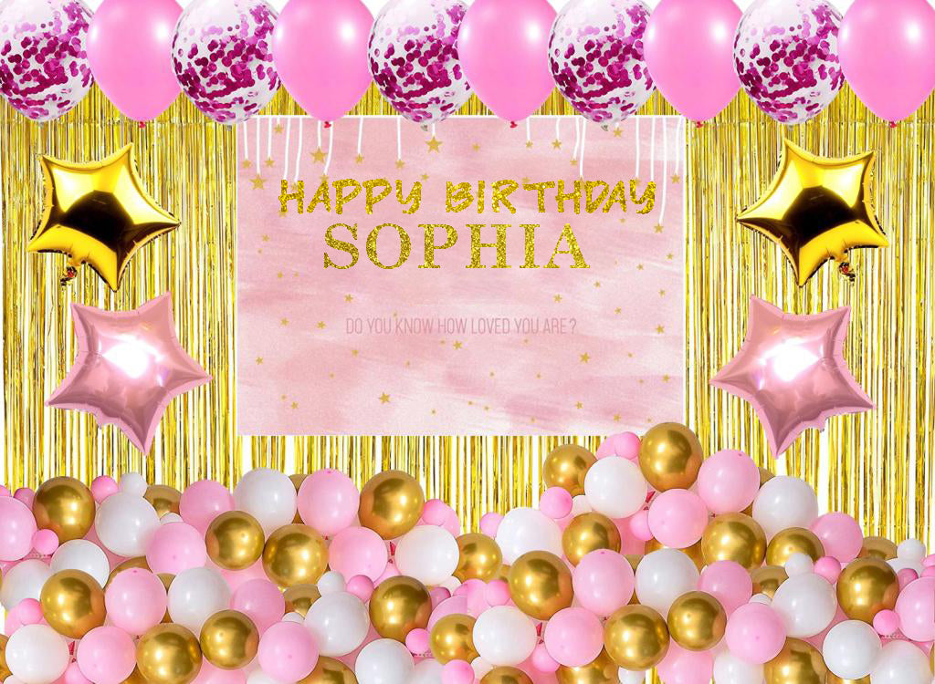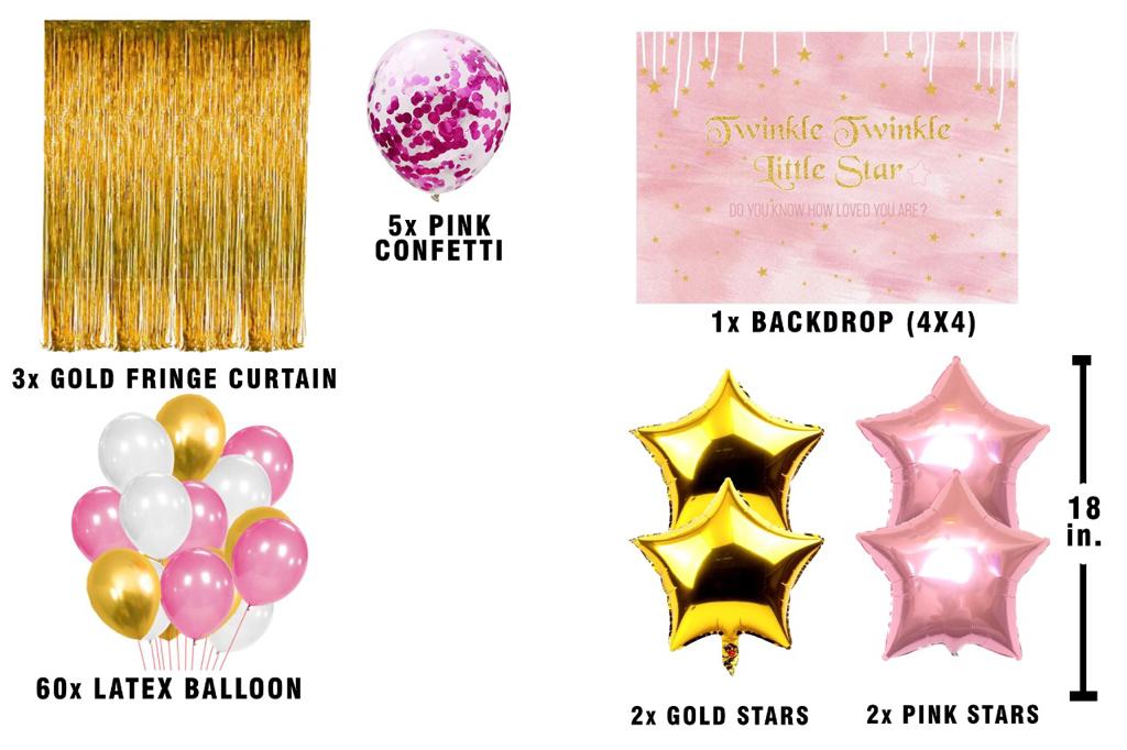 • Package Includes : 3 Pcs gold Fringe curtains; 1 First birthday backdrop- Size 4ft by 4ft, 60 pc latex balloons (pink, white and gold - 20 each); 5 pc pink confetti , 2 gold star and 2 pink star 18"inch.