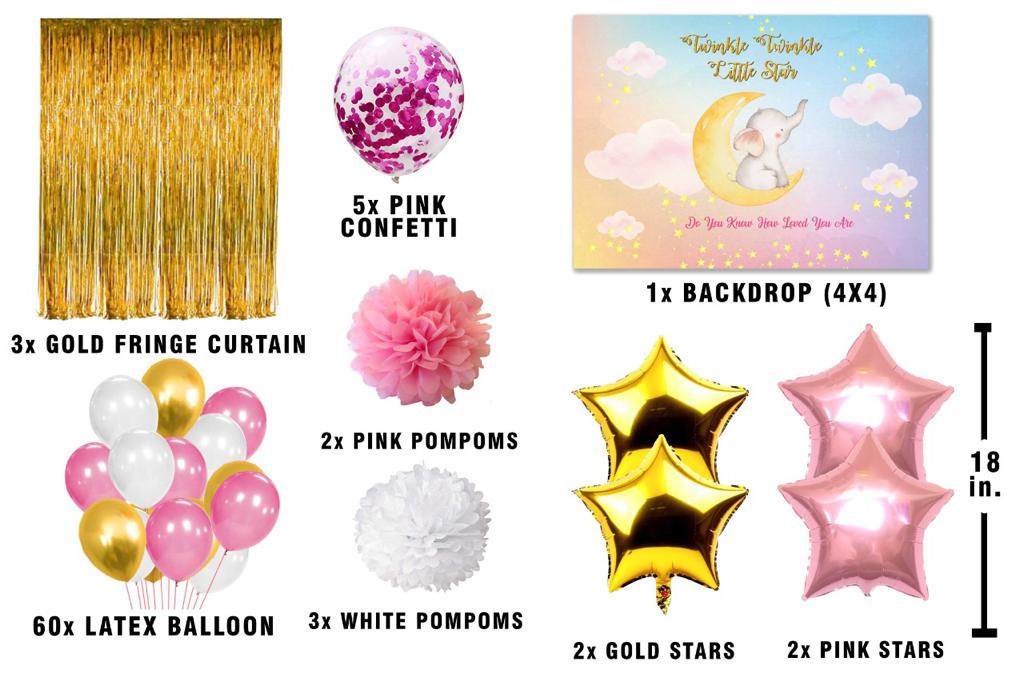 Package includes : 3 Pcs gold Fringe curtains; 1 First birthday backdrop- Size 4ft by 4ft, 60 pc latex balloons (pink, white and gold - 20 each); 5 pc pink confetti , 2 gold star and 2 pink star 18"inch and 5 Pom Pom -2 pink and 3 white.