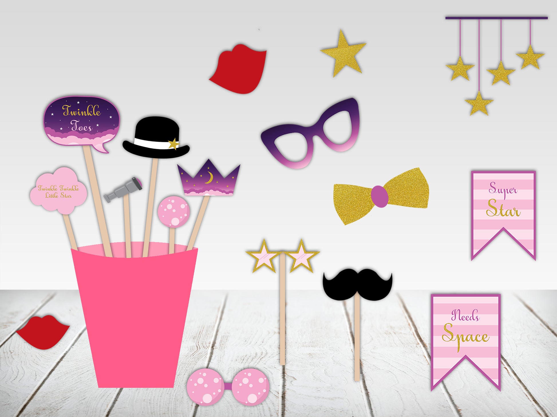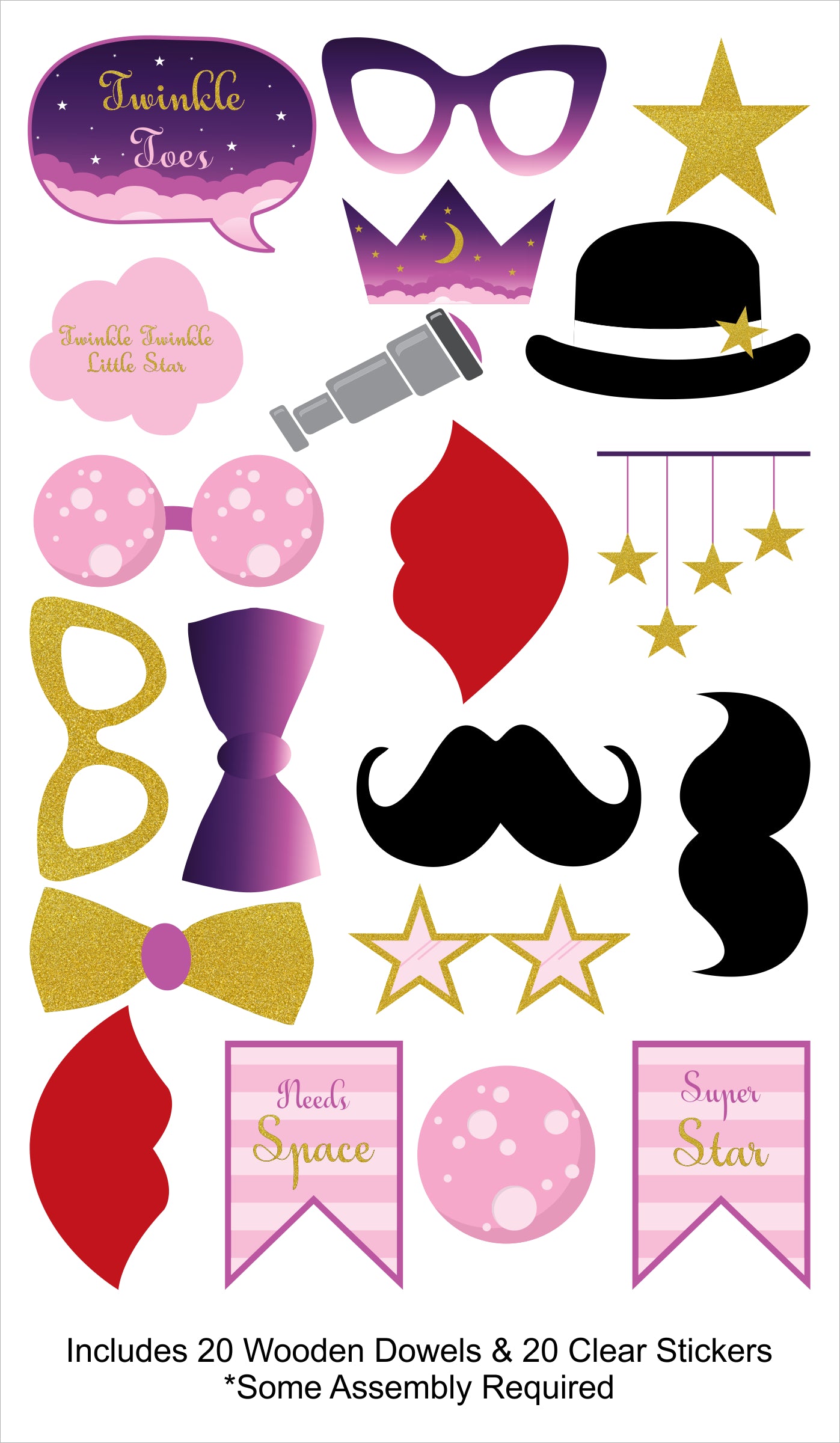 - Twinkle Twinkle Little Star Theme photo prop pack accompanies 20 pieces and will add fun for kids and adults. Take entertaining party photos while making memories with these photo booth props. Everyone will adore the fun photographs they will take with these excellent props.