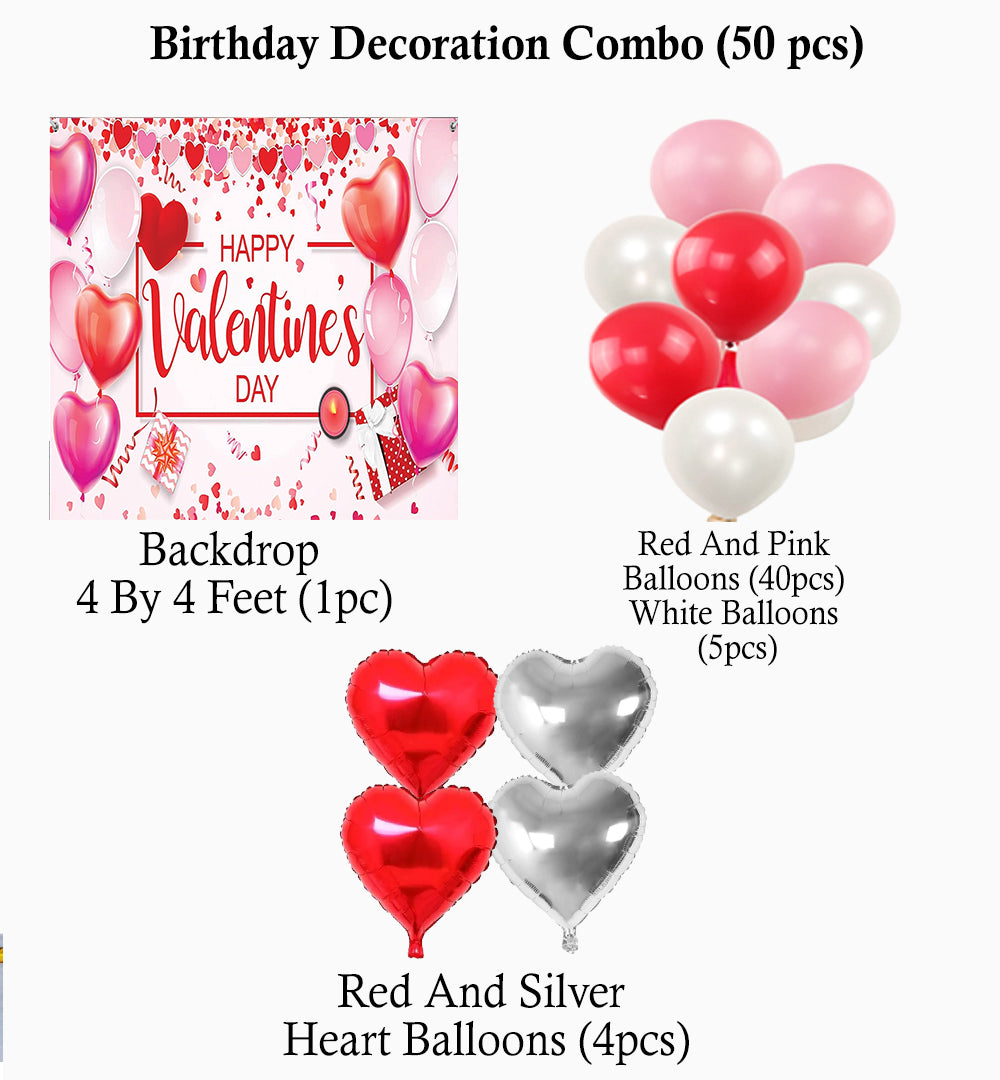 - PACKAGE: The decorations set includes: 4ft x 4ft backdrop banner made of high-quality star flex, 40 Latex Balloons Red and Pink, 5 pcs White Balloons, 4 pcs Red and Silver Heart Foil Balloons.