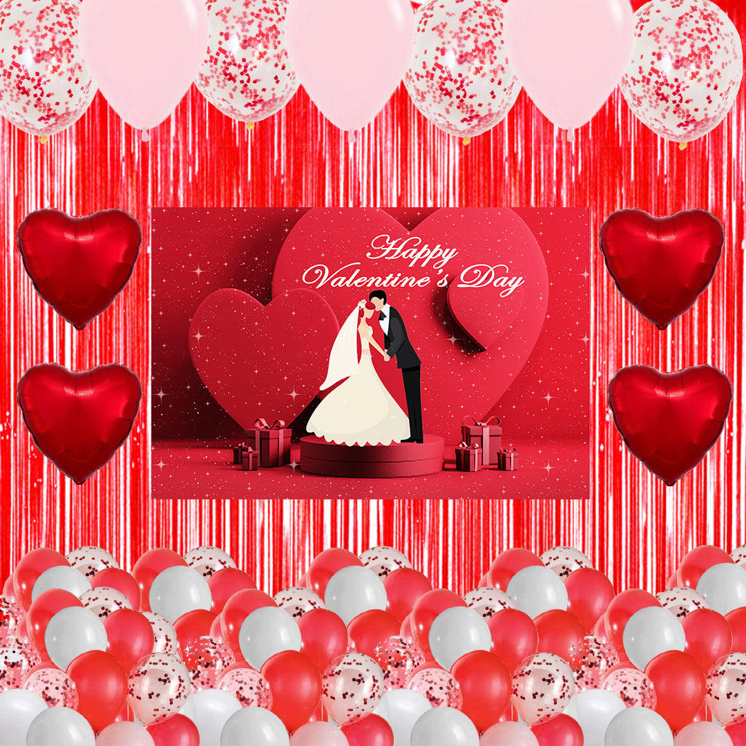 PACKAGE: 2 Pcs Red Fringe curtains; 1 Valentine backdrop- Size 4 by 4 ft, Red, Pink and White latex balloons multi color 20 each; 10 pc red confetti ,4 Red Heart Foil multi color 18"inch, Glue Dot and balloon strip.