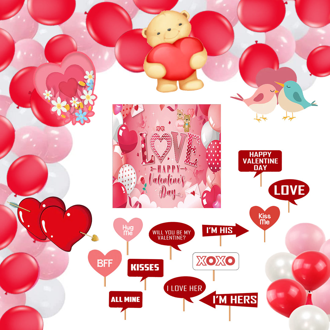 - Package Includes -, Backdrop - 3 by 3 ft, 40 pc Latex balloons (Red, Pink and White) and 4 paper Cutouts and 12 Party Props.