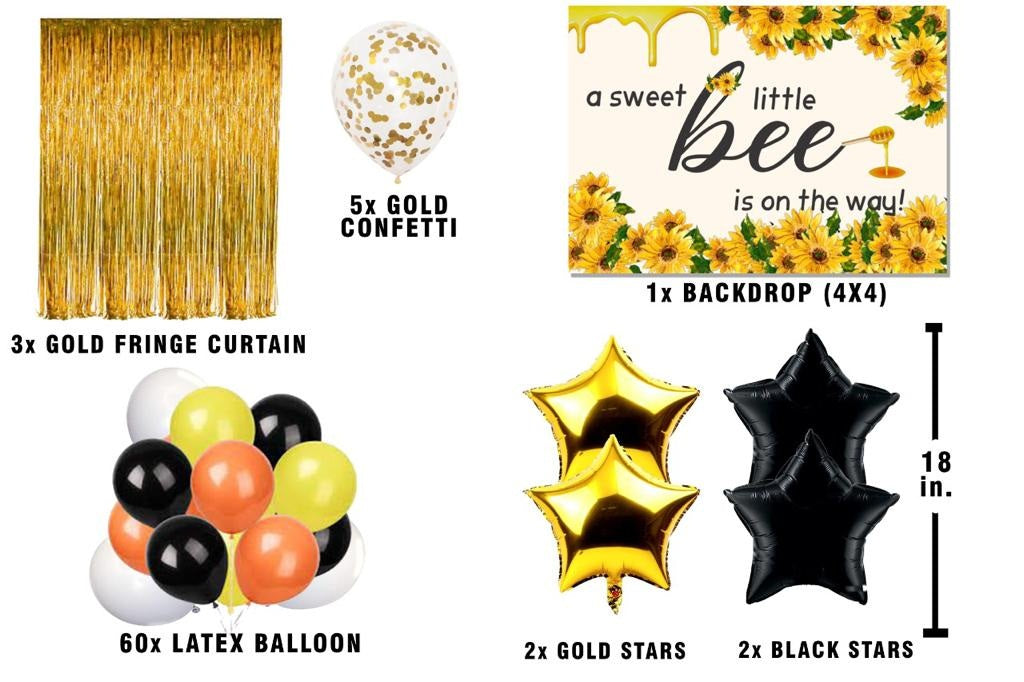 - Package Includes -3 Pcs Golden Fringe Curtains, Backdrop - 4 by 4 ft, 60 pc Latex balloons orange , black yellow and orange ), five pc gold confetti, two black star and two gold stars 18" inch each.