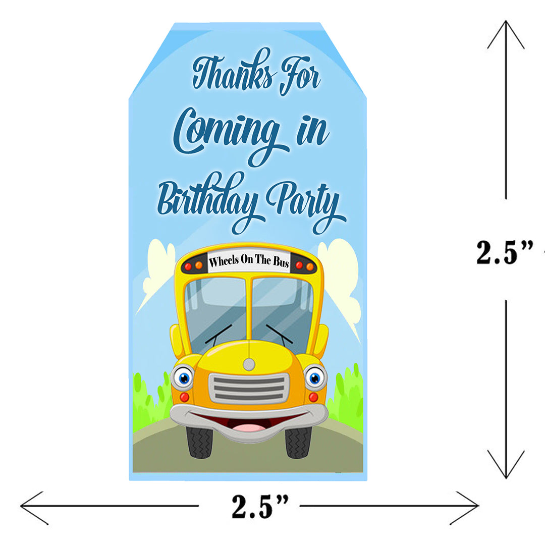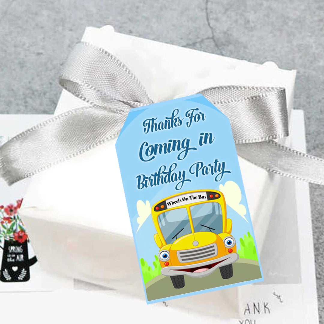 - The package includes - 20 Wheels on the Bus Theme thank you tags and a ribbon.